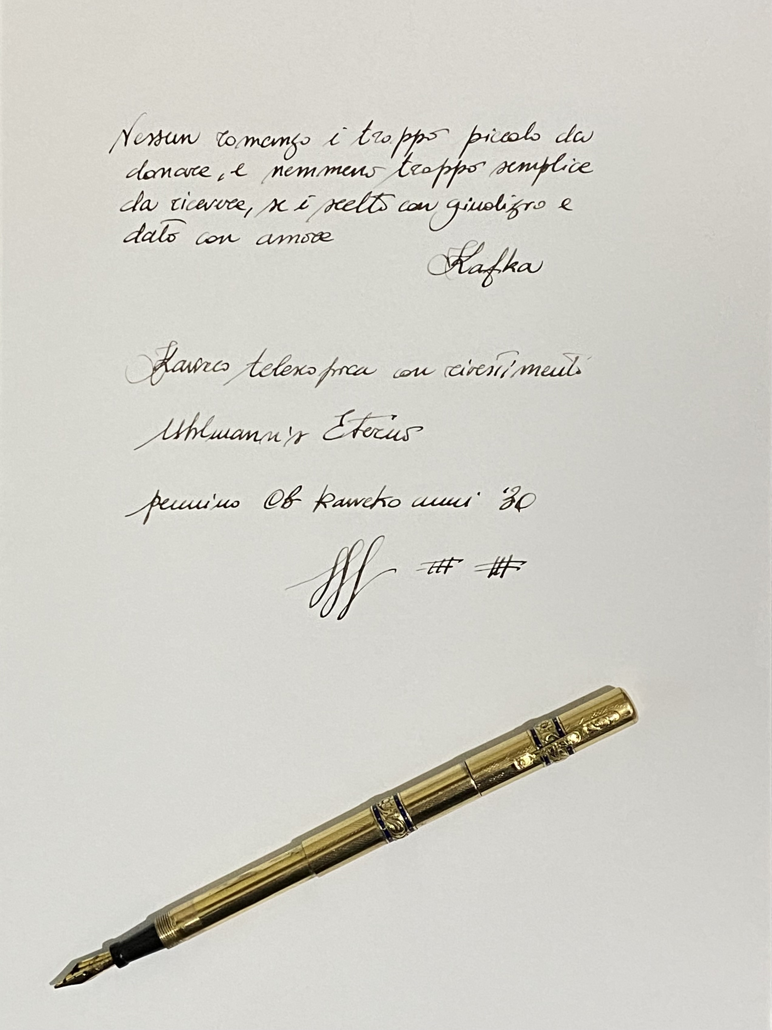 Stilografica interessante e molto bella. Ti capisco per la questione del pennino, eppure scrive con un bel tratto distintivo, sarebbe un peccato cambiarlo.