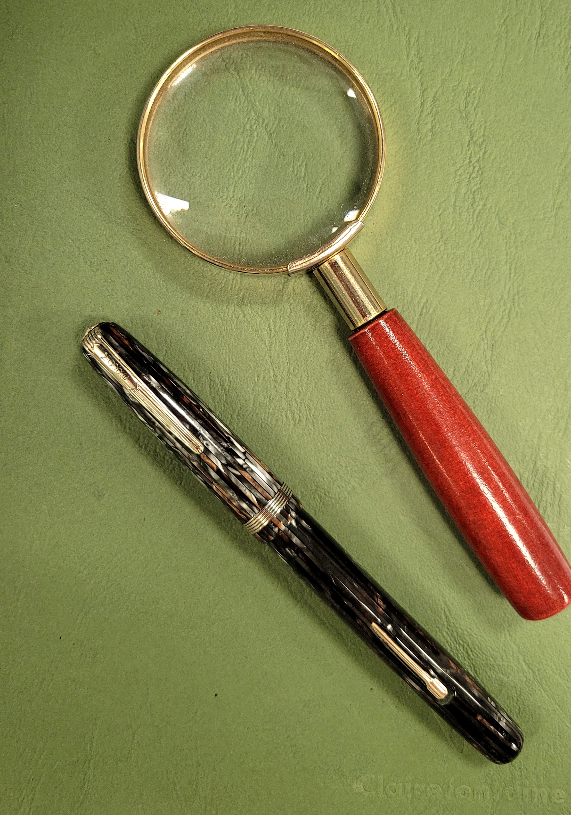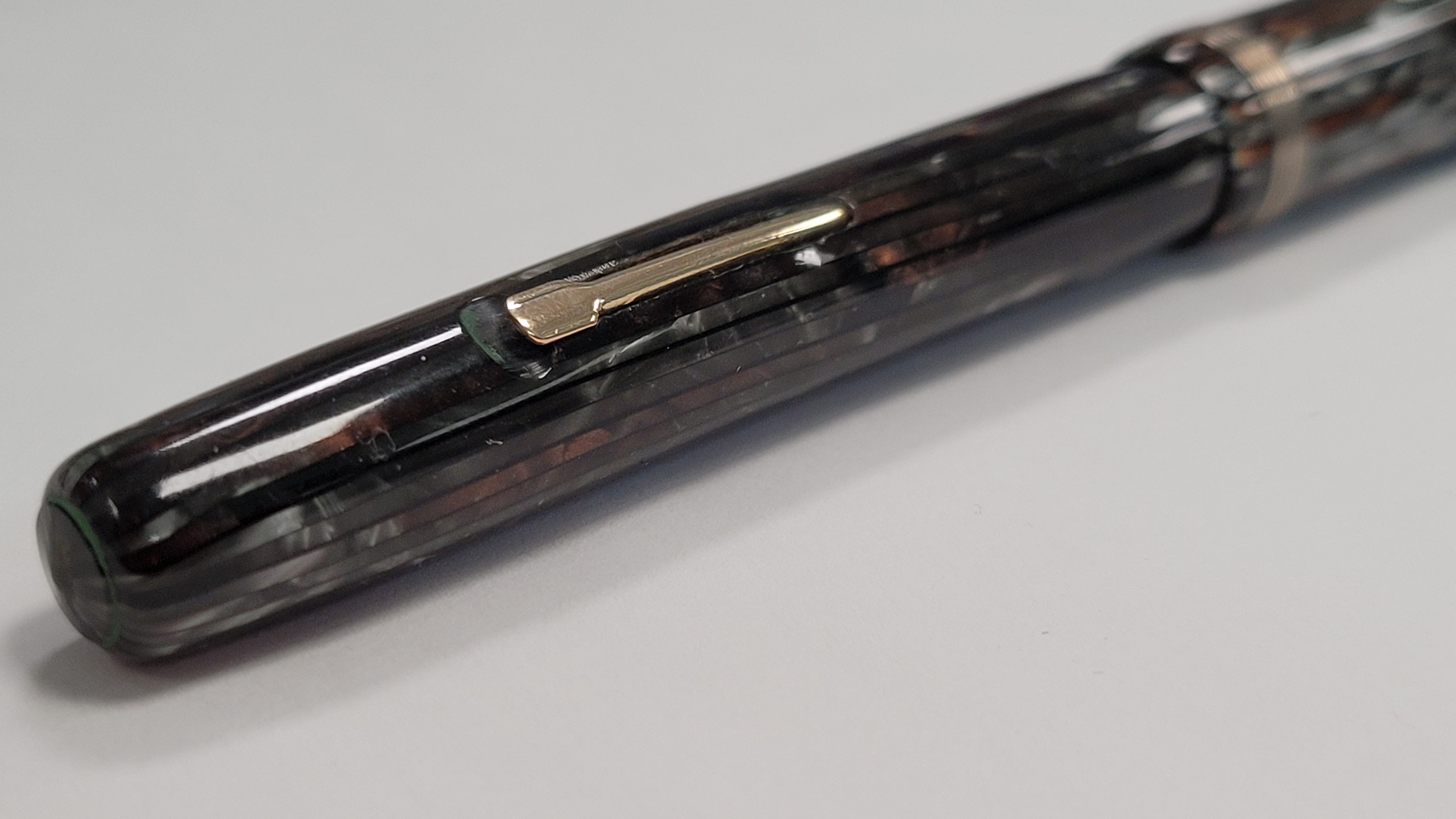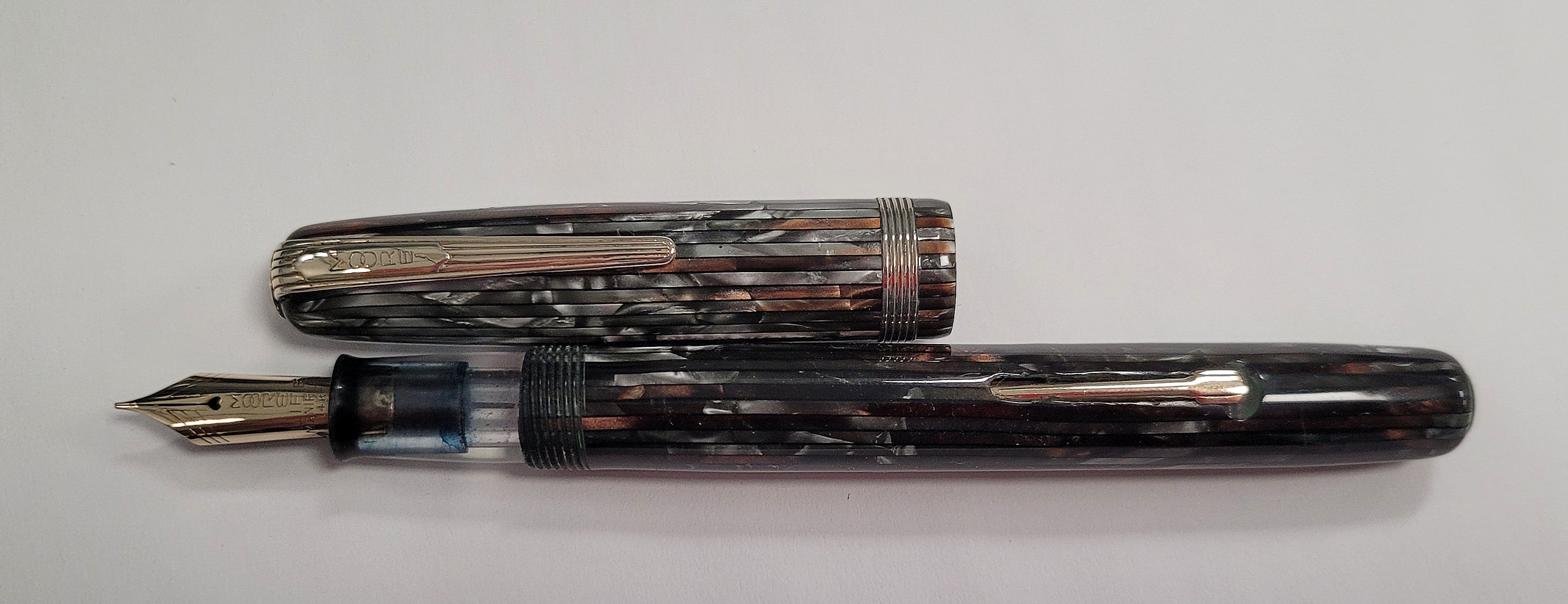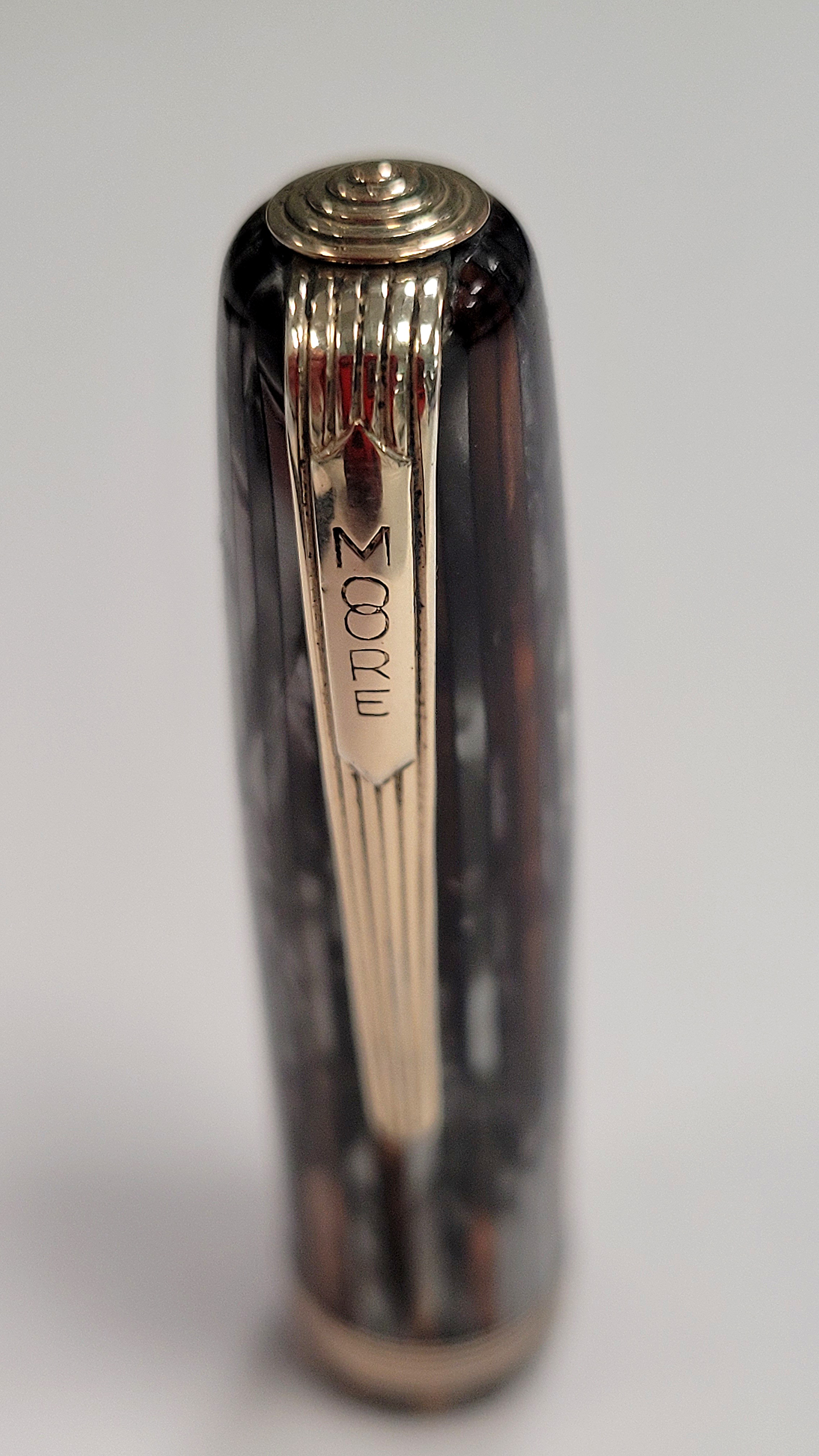 Questa 92-A realizzata in celluloide nei primi anni '40 era una penna di fascia media. Anche se il periodo di massimo splendore di MOORE era finito da tempo, l'azienda era sopravvissuta alla grande depressione e in quegli anni produceva ancora penne stilografiche di un certo pregio.