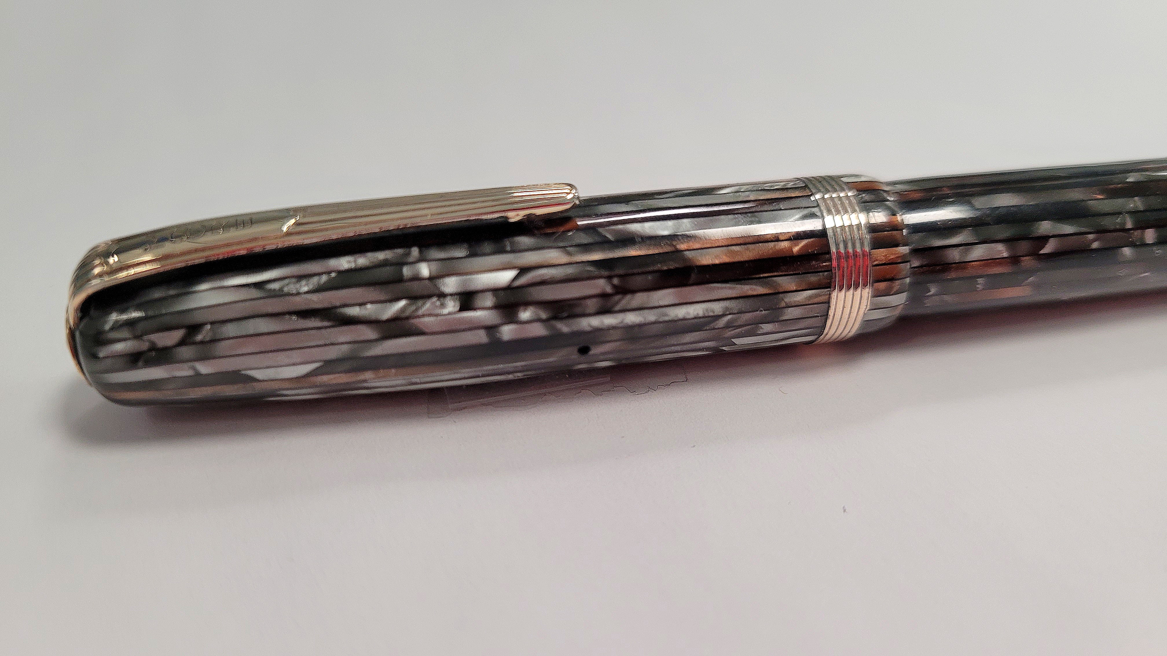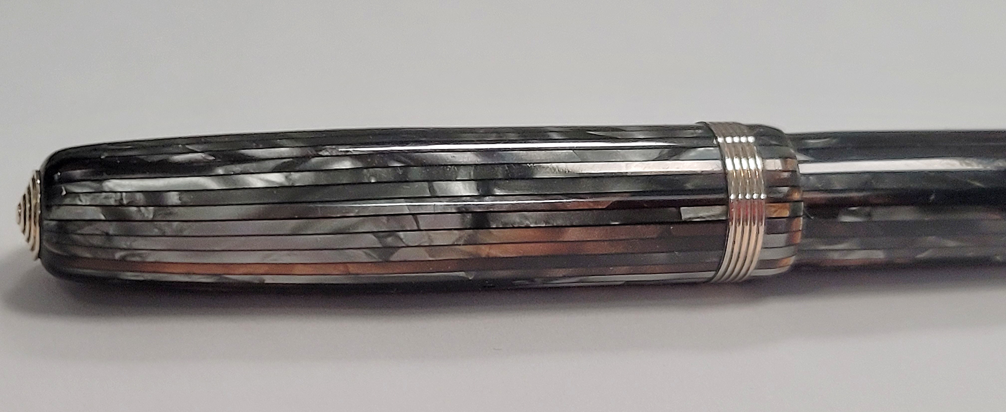 Molto bella la celluloide striata verticalmente, grigia e nera con parti color bronzo, un mix notevole che purtroppo è difficile da riprodurre in foto.