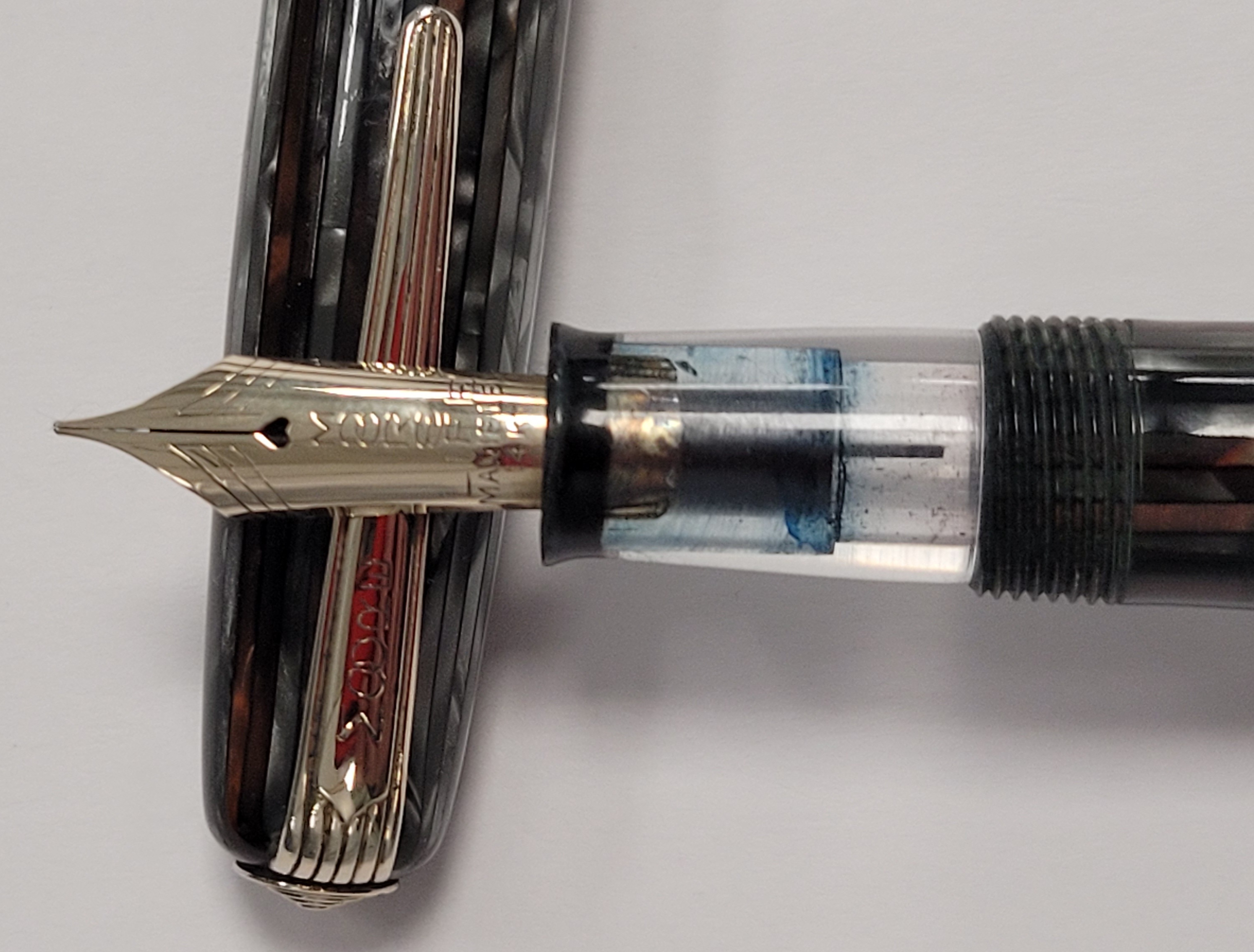 Le incisioni sul corpo della penna in mio possesso sono poco visibili, sono consumate, segno forse di un buon utilizzo negli anni, d’altronde ne ha più di 80. Il tappo si avvita o svita dal corpo con un giro e un quarto ma sfortunatamente la filettatura sul corpo è proprio nella zona in cui io tengo la penna impugnata e a lungo andare la trovo un po' fastidiosa, la sezione invece è trasparente e fa da specola per vedere quanto inchiostro rimane nella penna.