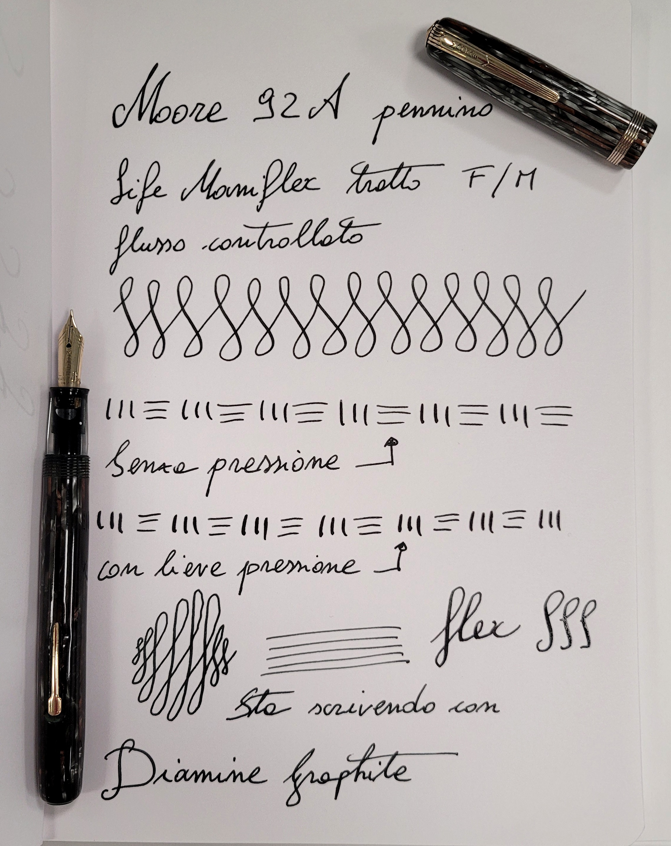 Probabilmente la parola LIFE si riferiva alla garanzia a vita, utopia di moda in quegli anni proposta dalle altre Big di mercato mentre MANIFLEX è il nome commerciale che MOORE dava ai propri pennini rigidi ma lievemente flessibili. Nello specifico il pennino di questa 92-A è più rigido che flessibile e forse perché usato molto ha qualche velleità stub. Poi l’adorabile sfiato a cuoricino al quale io non so mai resistere è bellissimo.
