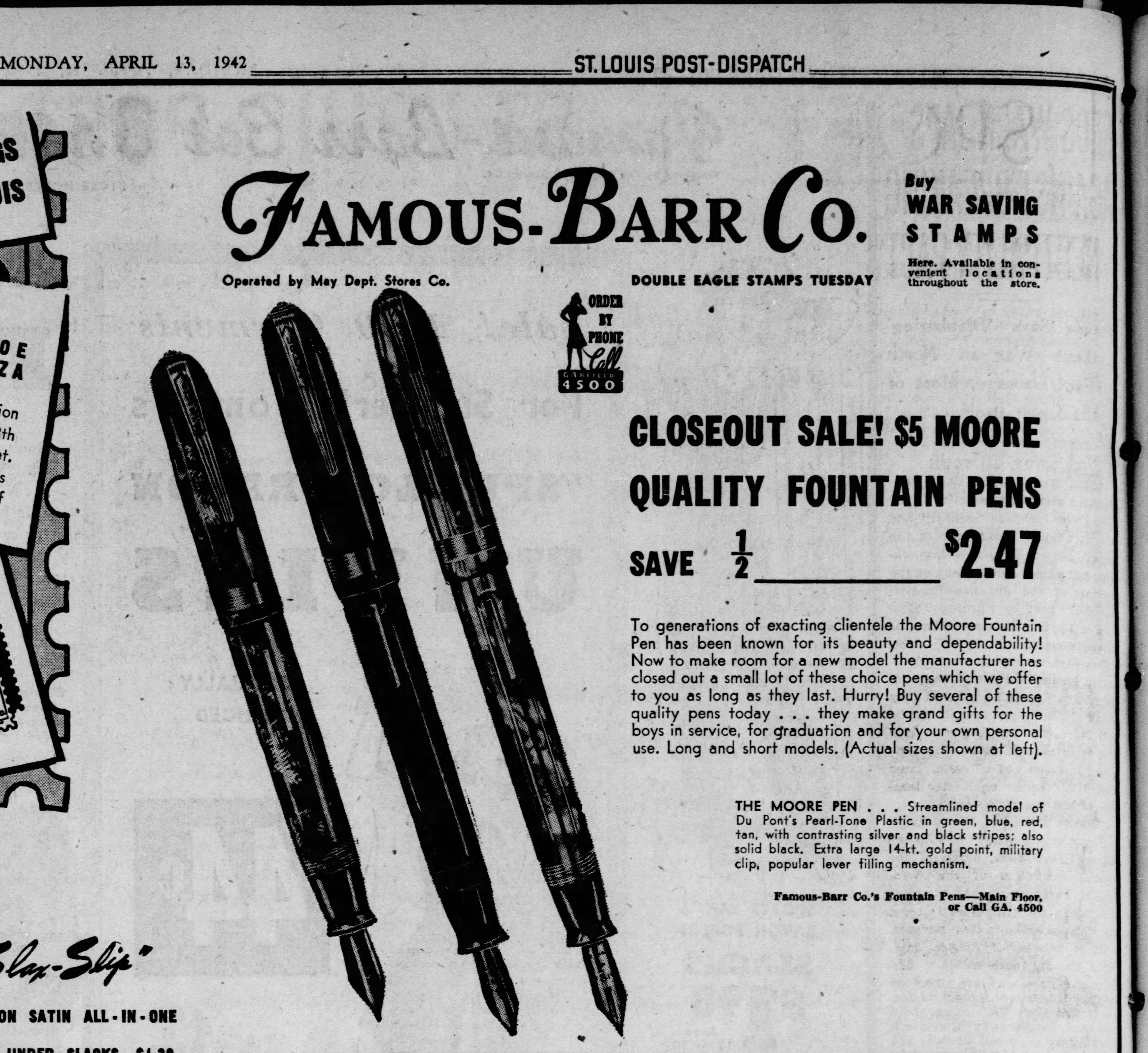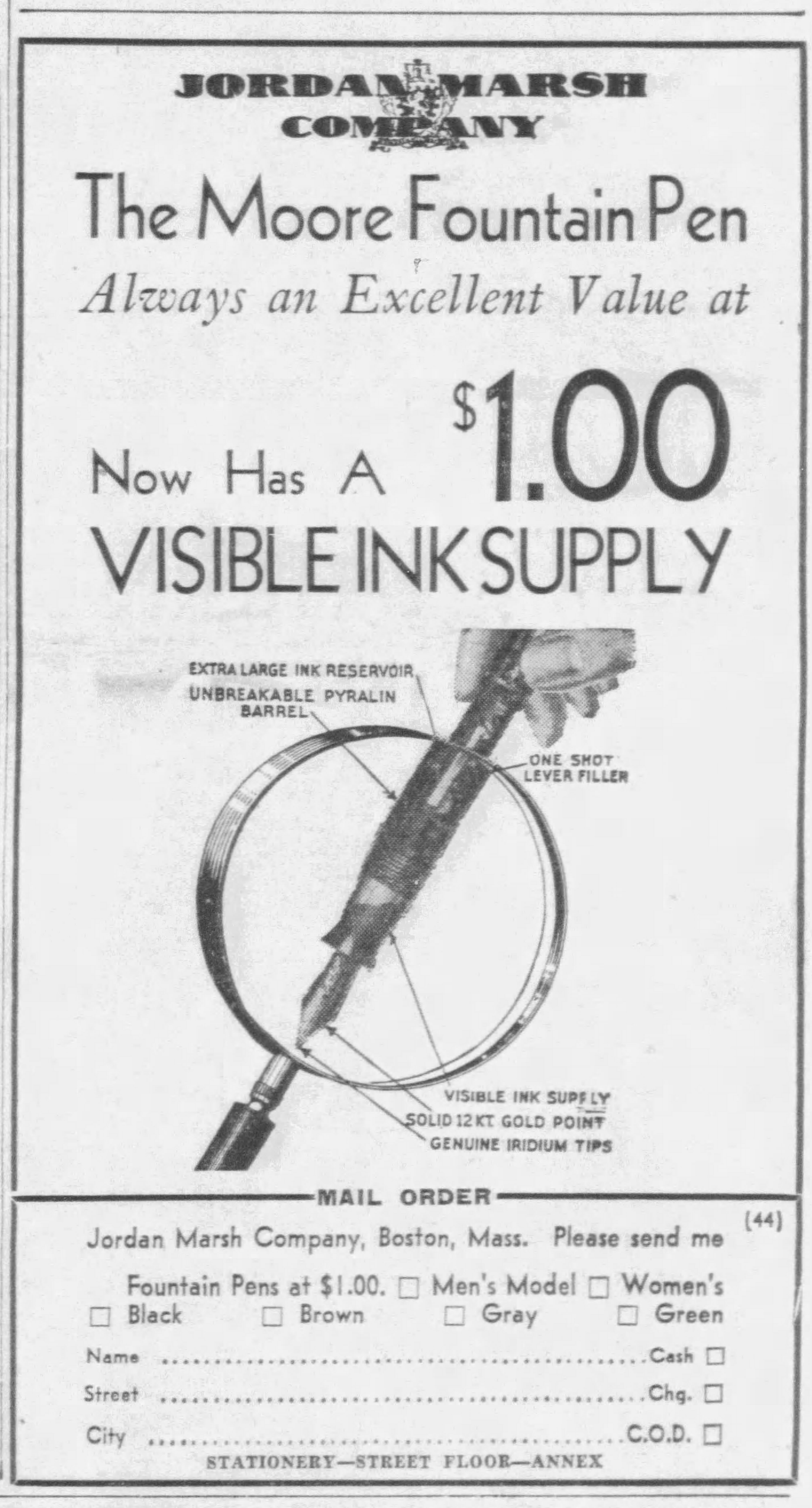 MOORE fu uno dei primi produttori di penne stilografiche e riscosse un certo successo dall'inizio del 1900 fino agli anni '40. Fu un attore importante del mercato statunitense durante i primi anni della loro produzione, aprirono la strada ad alcuni progetti e brevetti particolari, realizzarono penne in ebanite di livello medio alto così come i successivi modelli in celluloide 94, 96 o tuscan erano molto apprezzati dal pubblico, ma gran parte della successiva produzione era abbastanza banale. Poi, forse a causa di un marketing inadeguato e della forte concorrenza di quegli anni che hanno impedito loro di avere successo, MOORE ha assunto via via la caratteristica di “marchio minore”, si mise a seguire le tendenze del settore e a cercare di tenere il passo con i leader del mercato, le “Big 4” (https://www.fountainpen.it/Big_Four) quindi svanì come marchio alla fine degli anni '50. Storia interessante che vi invito a leggere il nostro fornitissimo wiki: https://www.fountainpen.it/Moore