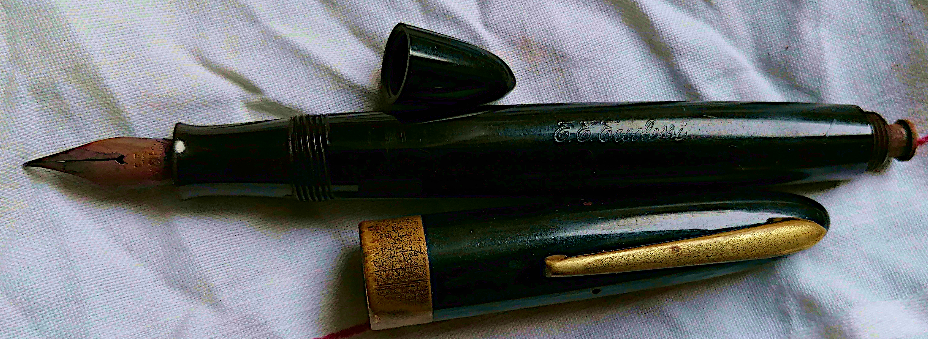 Buonasera, ho recuperato questa stilografica E.E.Ercolessi, in celluloide nera, pulsante di fondo, pennino in oro marcato EE ERCOLESSI 585 OSMIRIDIO.
