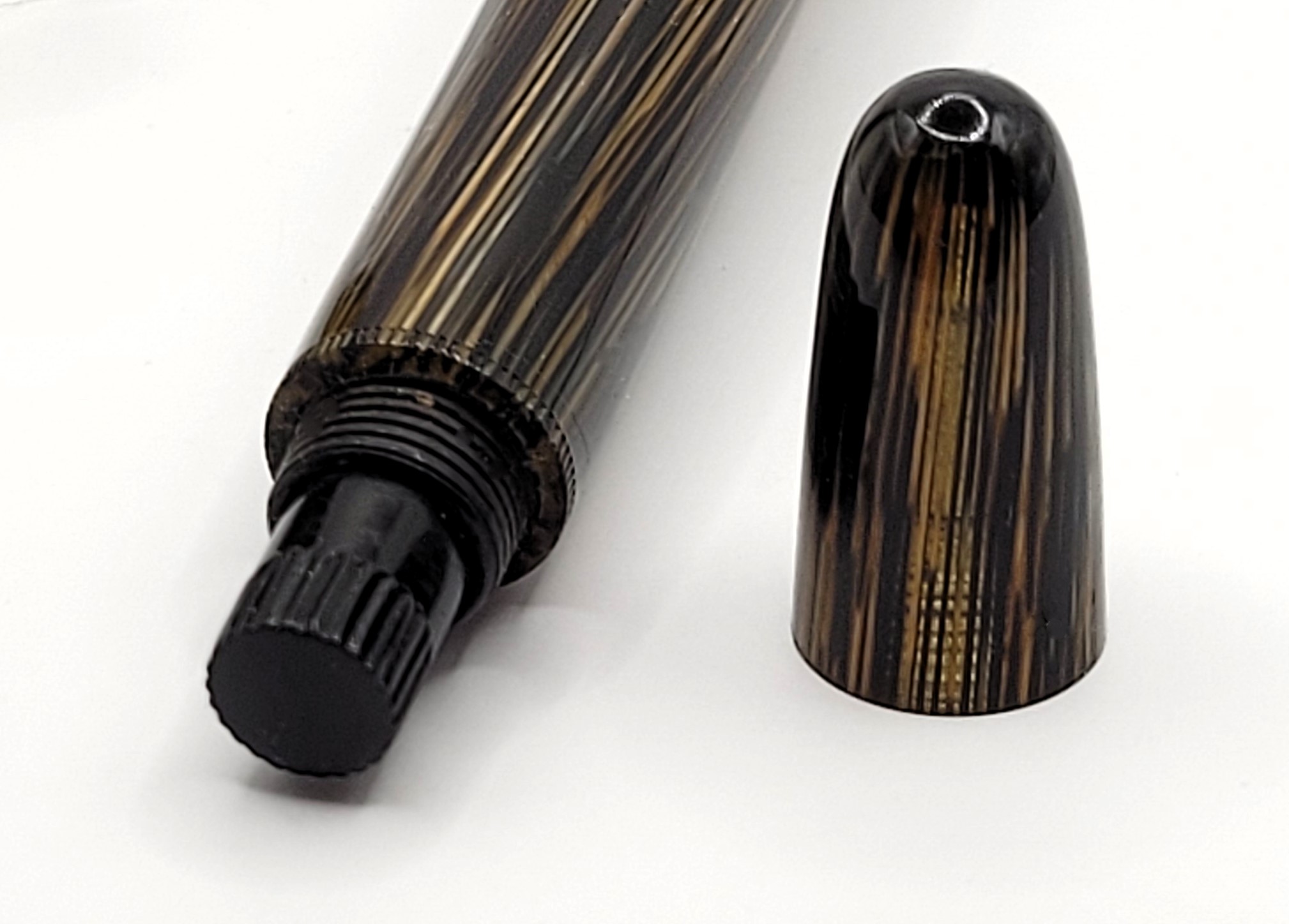 Trovo la penna particolarissima, soprattutto a livello costruttivo: nella mia ignoranza mi pare che la sezione dello stesso materiale del fusto non vada per la maggiore nelle penne vintage.