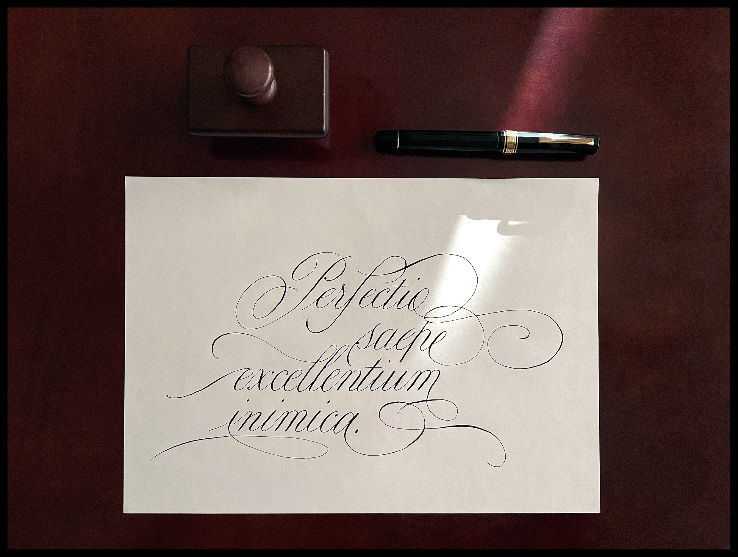 La carta é Tomoe Tiver, della vecchia. E' buona, ma sottile, e frequentemente quando il pennino fa le curve larghe la carta lo segue e s'arriccia e rovina tutto il lavoro. Bisogna tenere un dito che sostenga la carta vicino al pennino, cosa non comoda, soprattutto perché si rischia di passare sopra l'inchiostro fresco. Per me, per la calligrafia, carta bocciata.