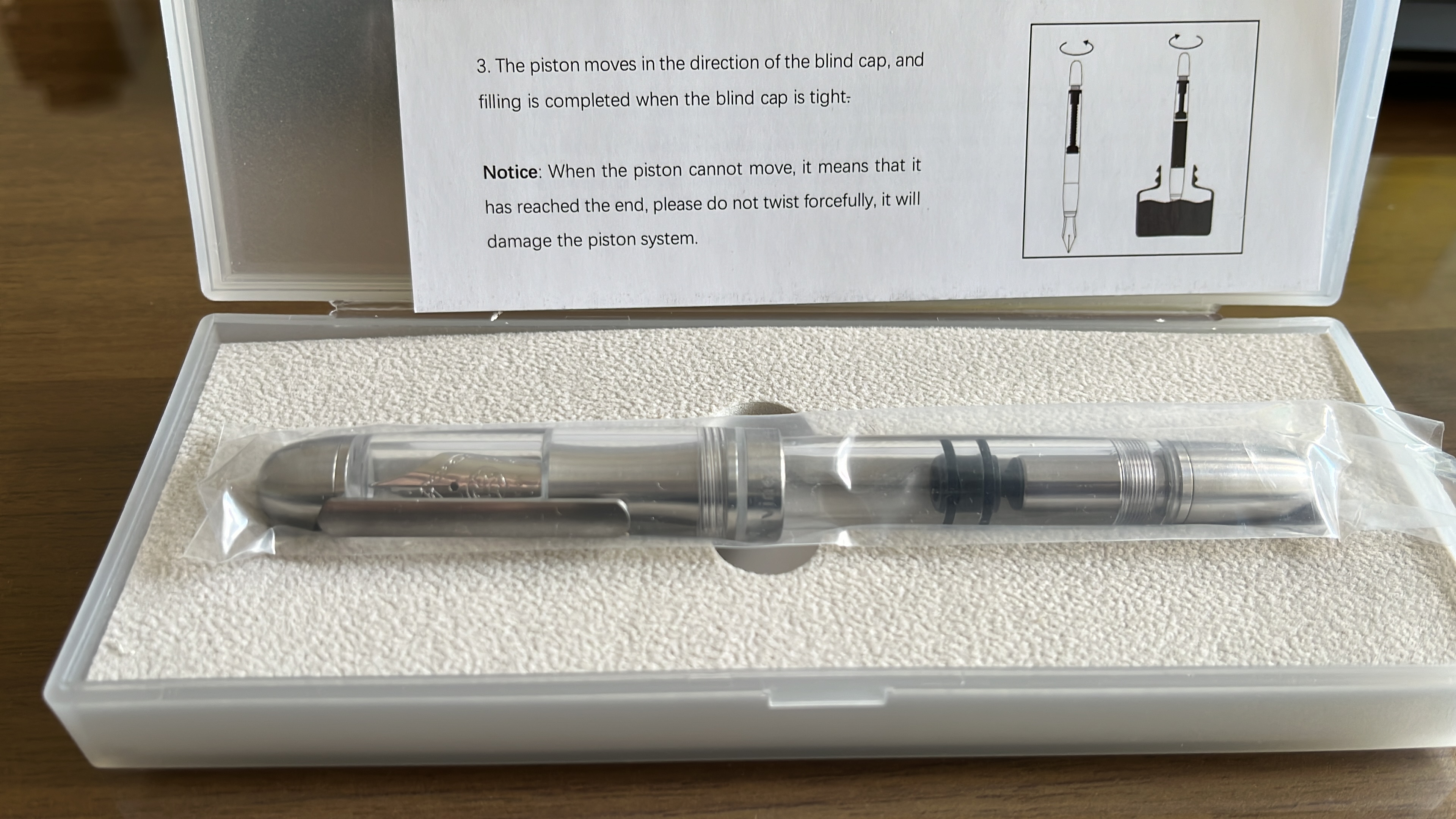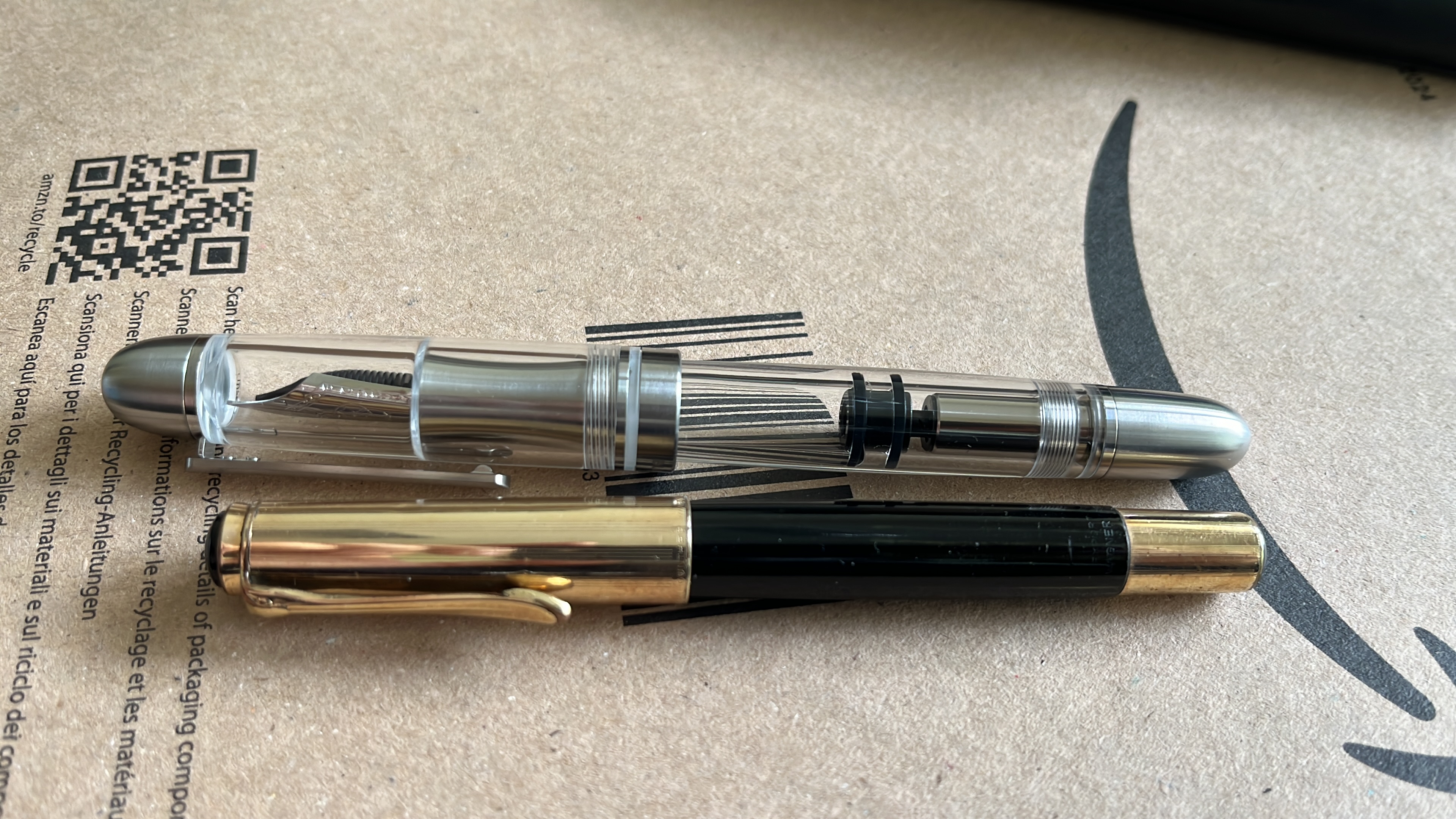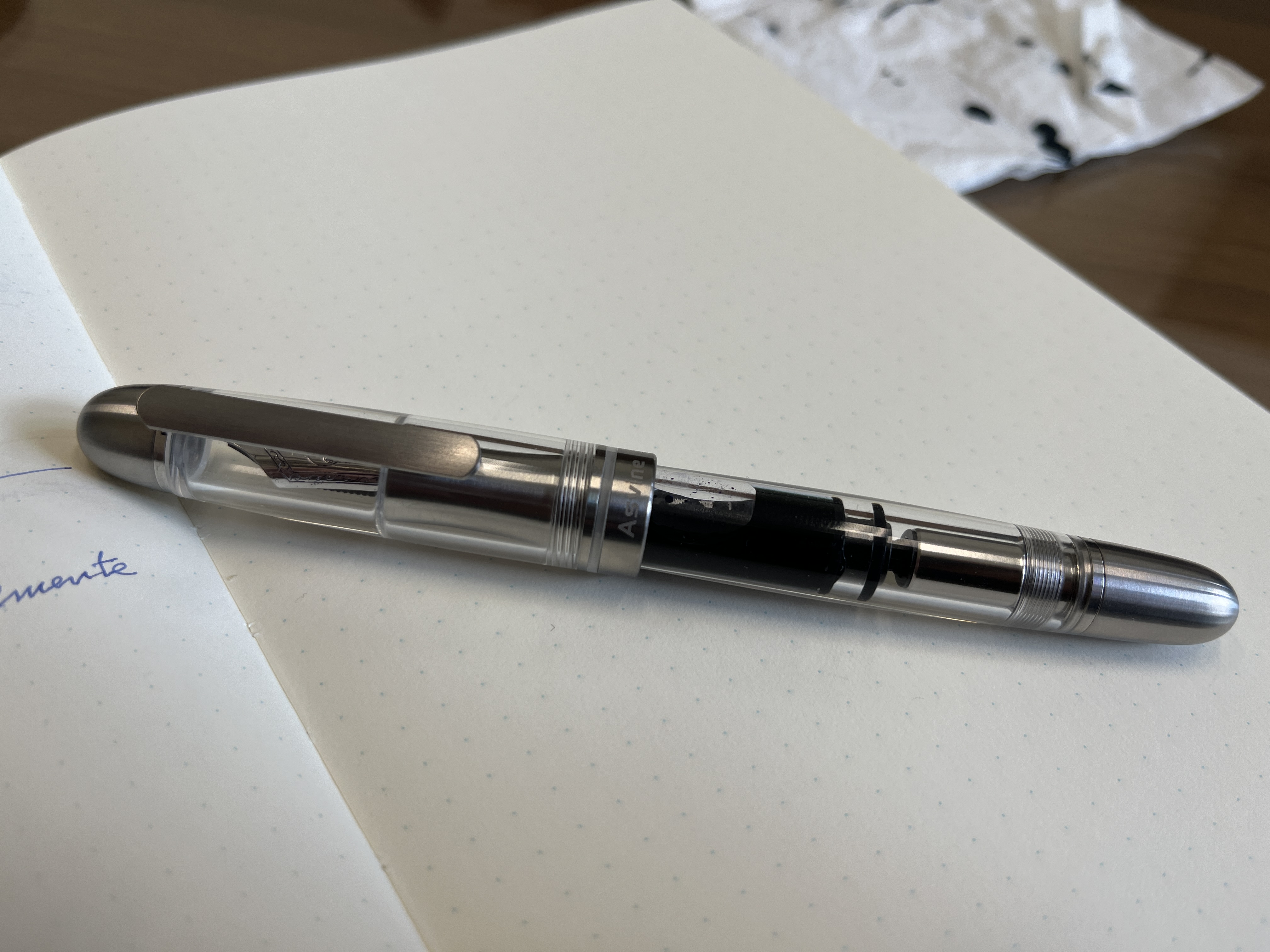 L’ho provata immediatamente con inchiostro Waterman con buoni risultati: il pennino è un EF europeo forse solo un po’ troppo secco (ma voglio provarlo con altri inchiostri), la penna è ben bilanciata (ma il tappo non calza posteriormente), e la sezione in titanio non è scivolosa.