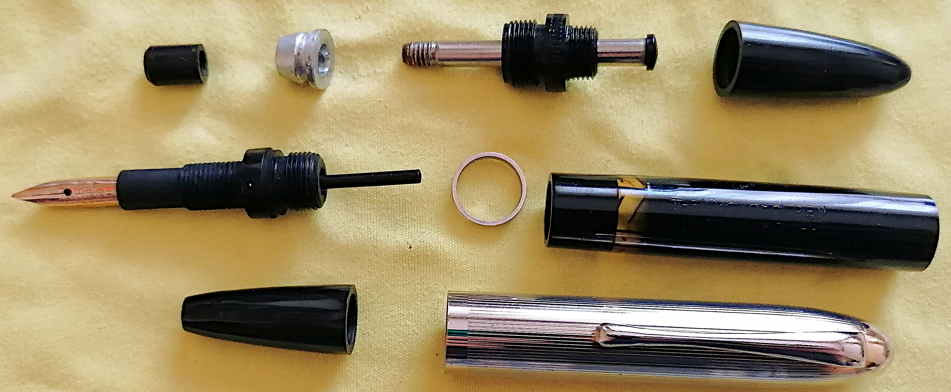 Sentiti i loro consigli, ho potuto poi rimontare il tutto, inserendo un sacchetto del n.18 (lungo solo 2,4 cm perchè non andasse ad occludere il tubicino di sfiato) sul terminale del pulsante d'acciaio. In sostanza si è rivelato un sistema più rudimentale (forse anche precedente?) del classico Vacumatic.