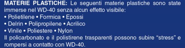 La scheda tecnica del prodotto dice che alcuni tipi di plastiche possono deteriorarsi a contatto con il WD40.