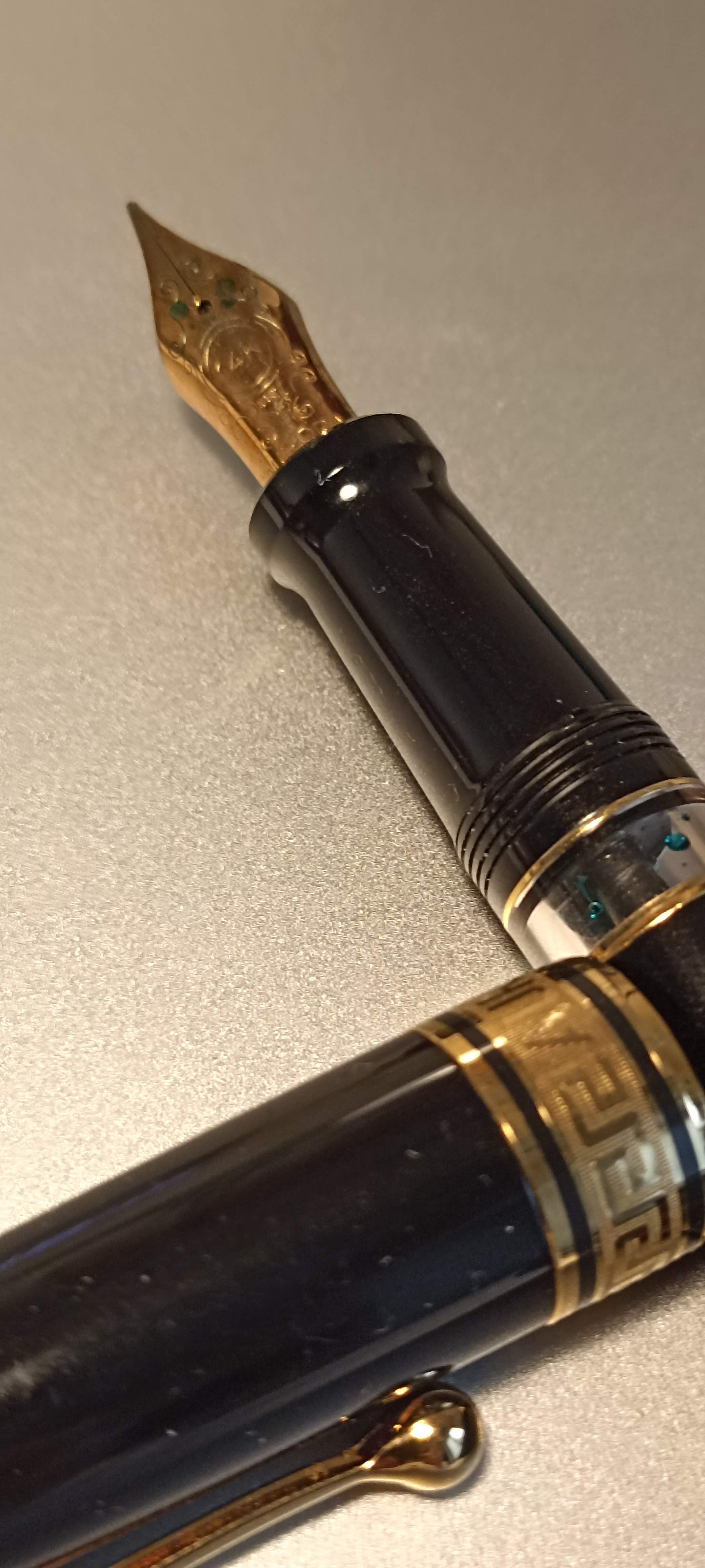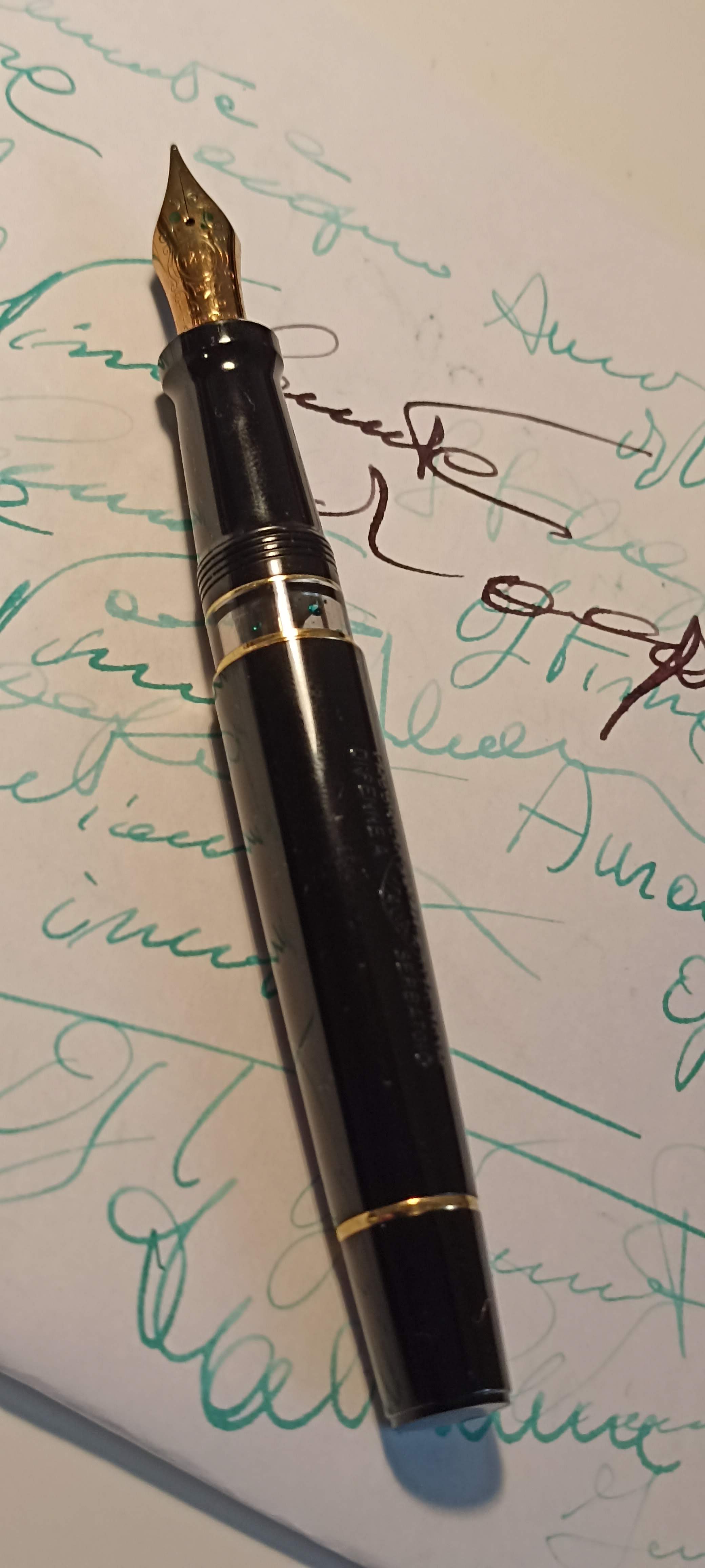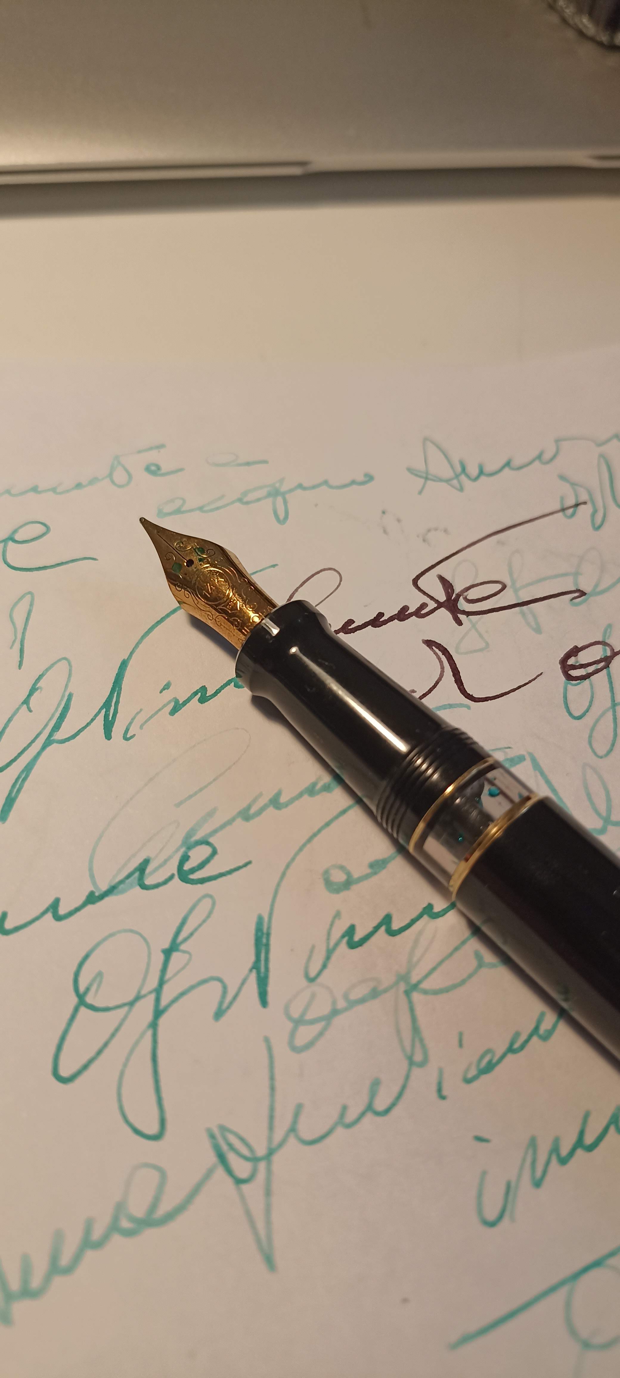 L'ho messa subito tra le pronte all'uso, accanto alla sua sorella OMAS Gentleman, che comunque preferisco soggettivamente nel lato estetico (piu discreta) ed anche pratico in quanto le sfaccetttature impediscono alla penna di rotolare sulla scrivania. Il pennino dell'Aurora sembra piu flessibile, piacevolmente, ma anche con minor feedback della sorella. Questione di abitudine, credo.......