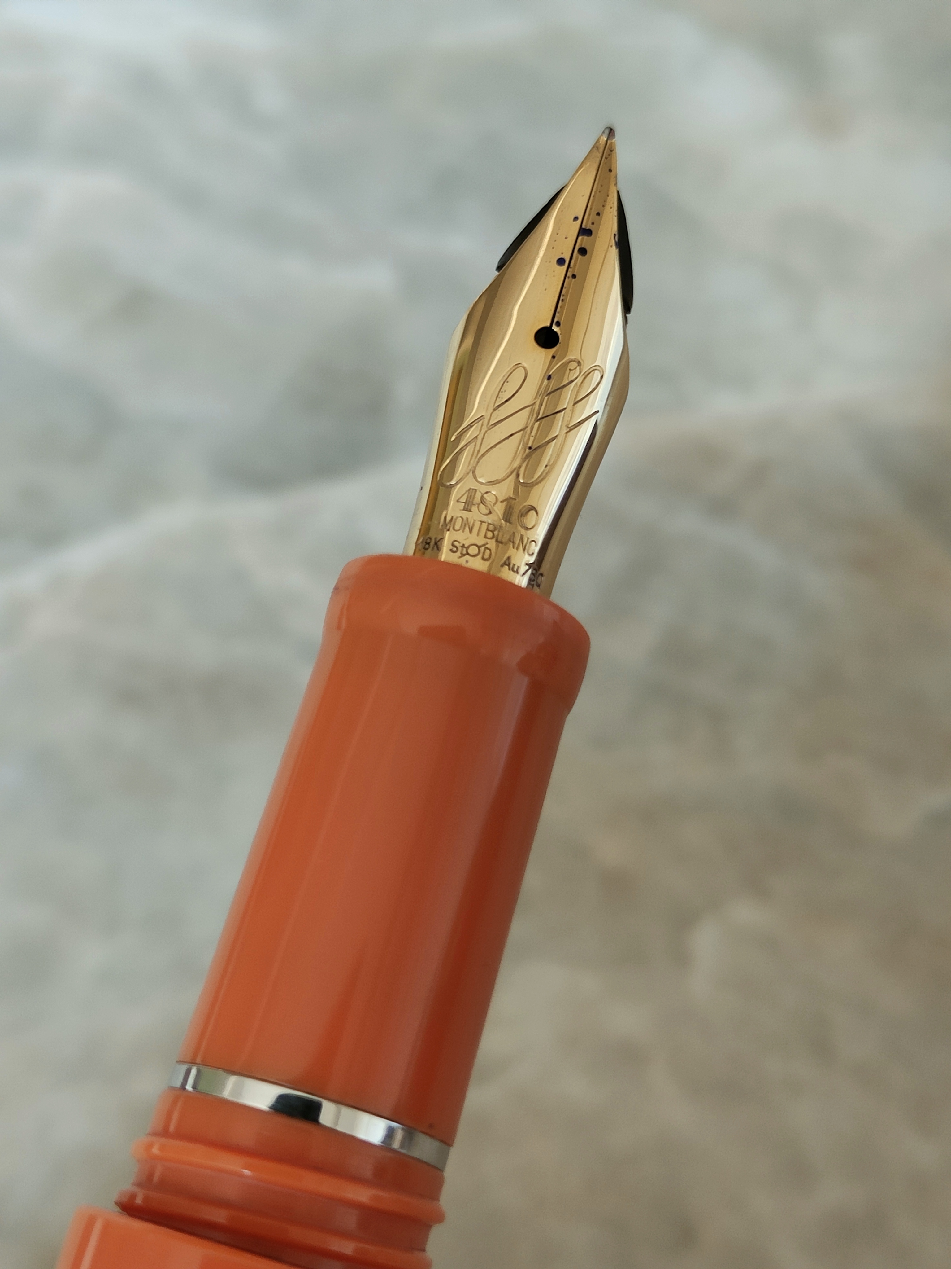La Scribo montava un B Flex che è stata una grande delusione, perché più che flex era molle, coi rebbi che non ne volevano sapere di stare in posizione. Poi, ad un certo punto ha smesso di scrivere. Ho dato la penna per spacciata finché un caro amico un giorno di settembre mi ha invitata a pranzo per farmi provare la sua Montblanc 146 Calligraphy che saltava come un canguro. Era tornata così dal centro Montblanc di Amburgo che aveva sostituito il pennino in garanzia, senza comunque riuscire a metterne uno funzionante, e ha restituito il "vecchio" pennino al mio amico, credo per errore. Per dargli una mano mi sono offerta di riportare la 146 al negozio Montblanc, lui mi ha offerto la pizza e regalato il pennino extra