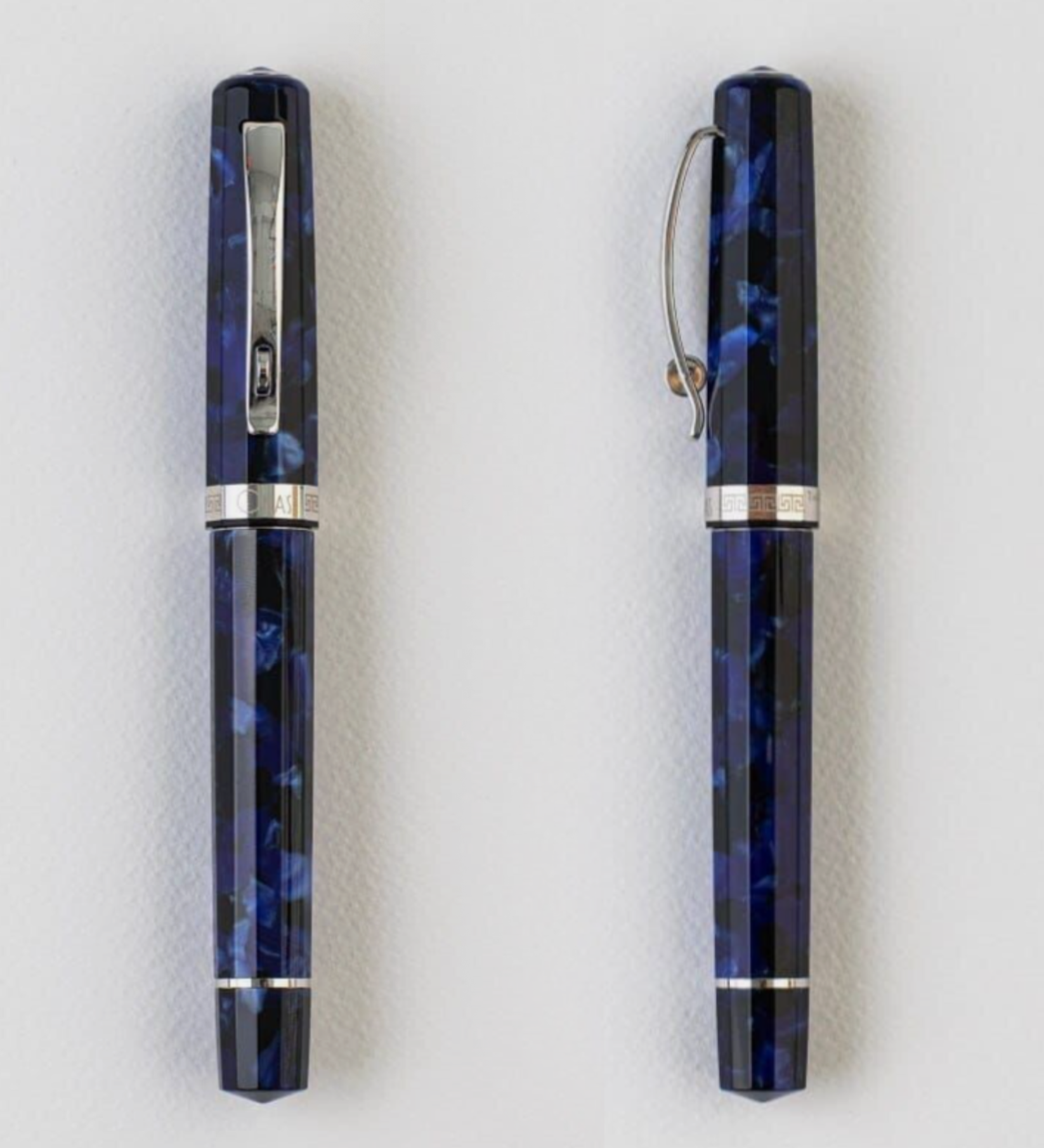 La stilografica ha un fermaglio in “stile Delta” e due anelli con la greca “omasiana” in altorilievo, uno alla base del cappuccio e l’altro sulla sezione, anch’essa in resina - a differenza della sezione metallica della Grand Paragon. Quando dico che le nuove penne sono ”quasi” perfettamente modellate sulla Grand Paragon è perché mi pare che il fondello, almeno nella stilografica, sia forse leggermente meno conico (e per questo meno bello) di quello dell’originale.