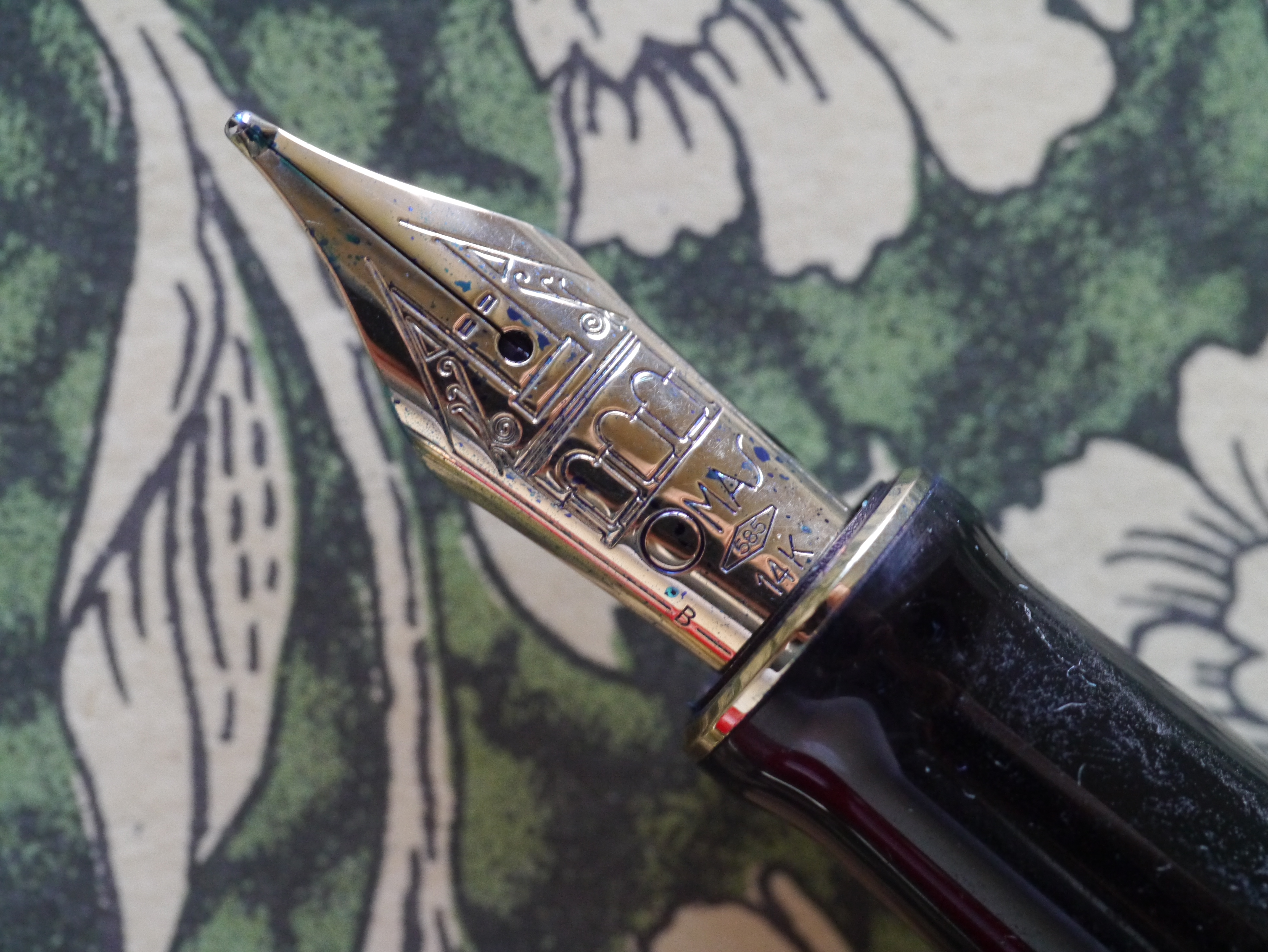Il pennino in oro 14K ha una incisione originale, che mi pare si rifaccia a vari “motivi” storici di OMAS. A giudicare dalle fotografie, mi sembra sia una taglia 6, un po’ piccolo per le dimensioni della penna, così come lo era quello della Grand Paragon originale.