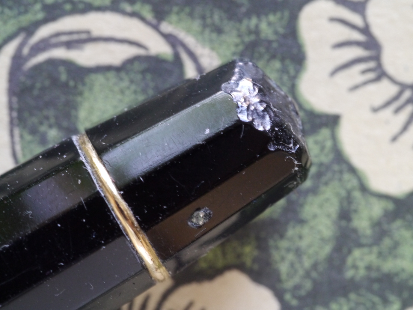 La penna OMAS EXTRA 361 [F] misura standard (media) in celluloide nera faccettata (12 facce) tornita dal pieno, parti metalliche a vista laminate oro, cappuccio a vite, pennino centrale corazzato Omas in oro 14 carati, con sistema di doppia scrittura rigida/flessibile, caricamento a pistone, produzione Italia, anno 1948.