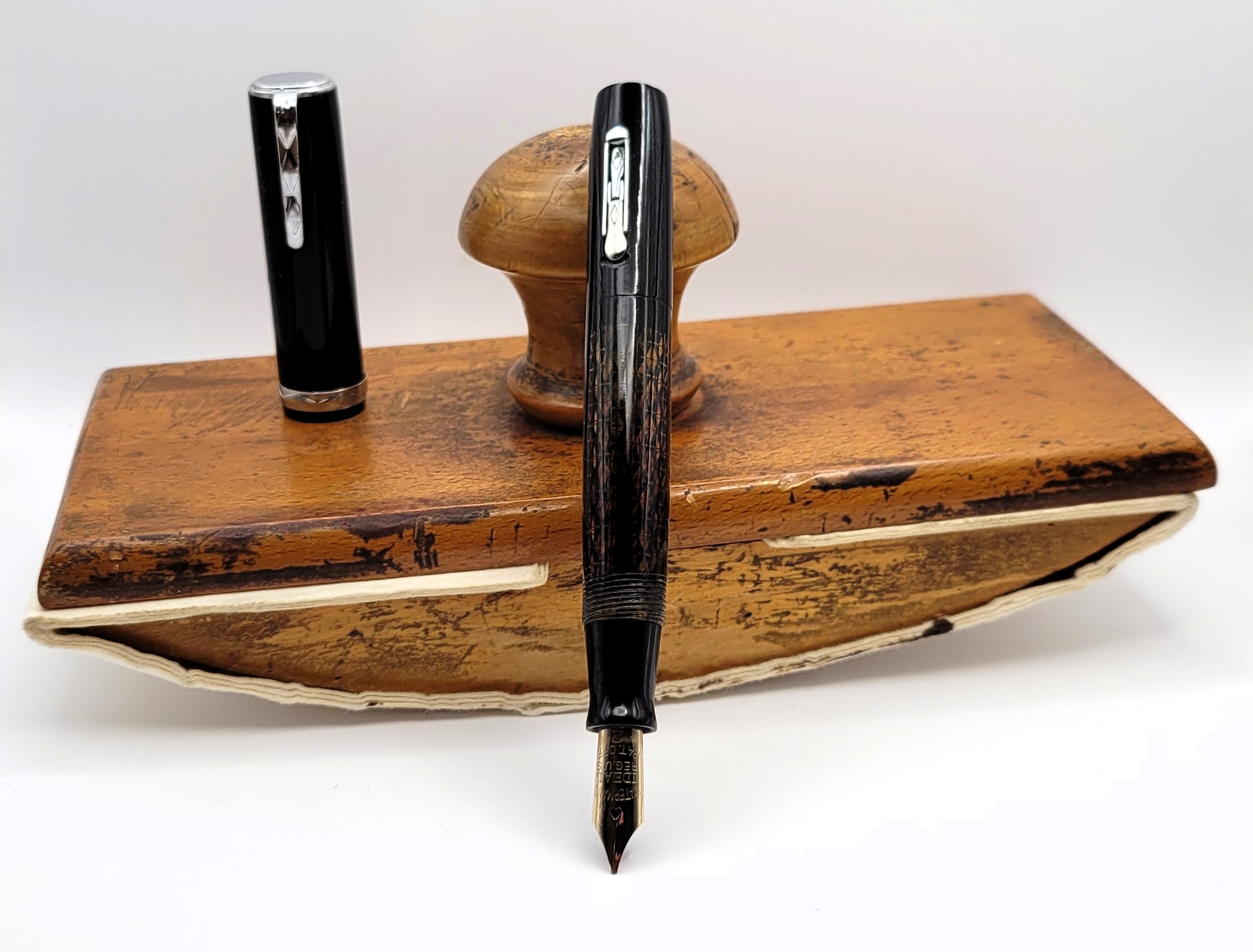 La penna, dopo un attento restauro (per niente semplice) ed amorevoli cure, ora è tornata a splendere come un tempo è in ottime condizioni, le finiture cromate luccicano ancora, le incisioni sono ben visibili ed il sistema di carica funziona perfettamente. Dulcis in fundo il pennino in oro 14Kt: un meraviglioso Waterman n. 2 flessibile. Senza pressione ha un tratto XF/F con un flusso controllato ma appena si preme lievemente arriva facilmente ad un BB ed immediatamente ritorna a scrivere finissimo, è molto reattivo in perfetto stile "pennino in oro anni '30"