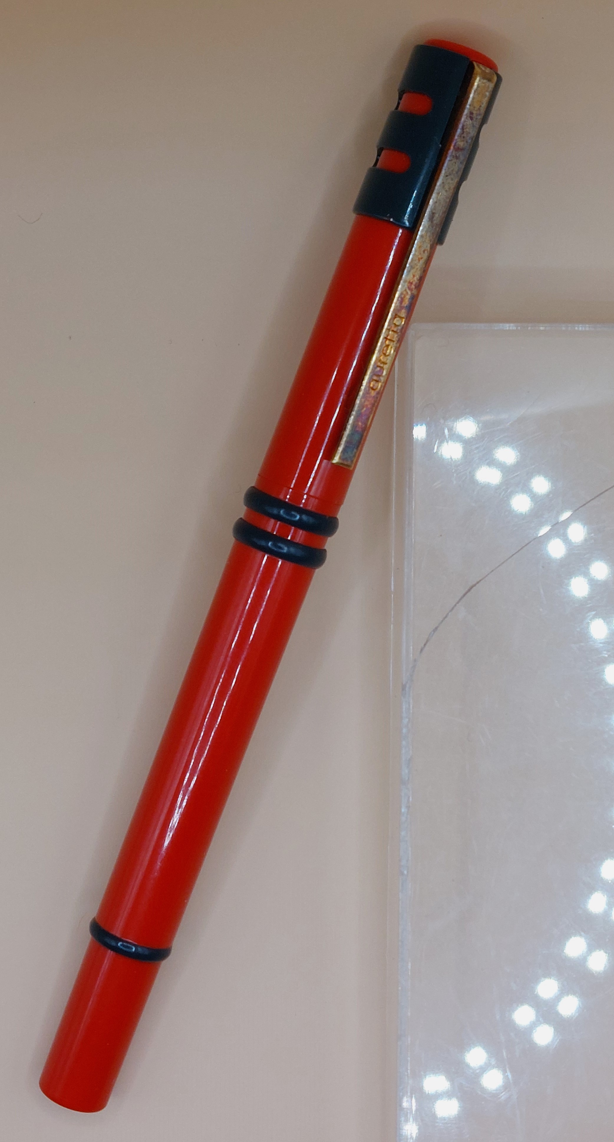 Periodo: Circa metà anni '80 Materiali: Plastica, solo la clip è in metallo Pennino: Acciaio senza indicazioni, il tratto sembra un fine abbondante. La penna scrive bene, è leggera e di dimensioni contenute, elementi che per una penna scolastica credo siano vantaggi.