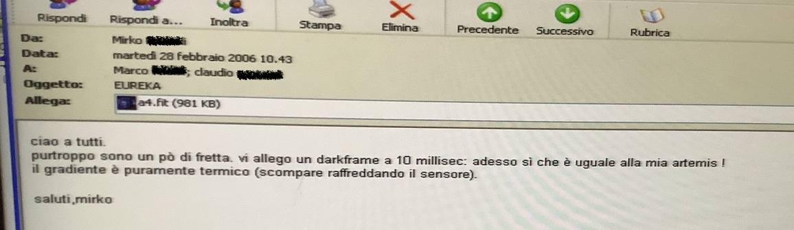 Inoltre un ccd da usarsi in questo campo, deve operare leggermente fuori specifiche del costruttore al fine di ottenere un'alta sensibilità e basso rumore, e quindi cose "commerciali" già belle e pronte erano da escludersi . Il vero problema è che all'epoca le informazioni erano pari a zero (anche adesso eh...) e quindi - per quanto mi riguarda - era tutto un prova e scopri: alla fine ci son voluti due anni di lavoro per l'ottimizzazione e secondo me si poteva fare ancora di meglio.