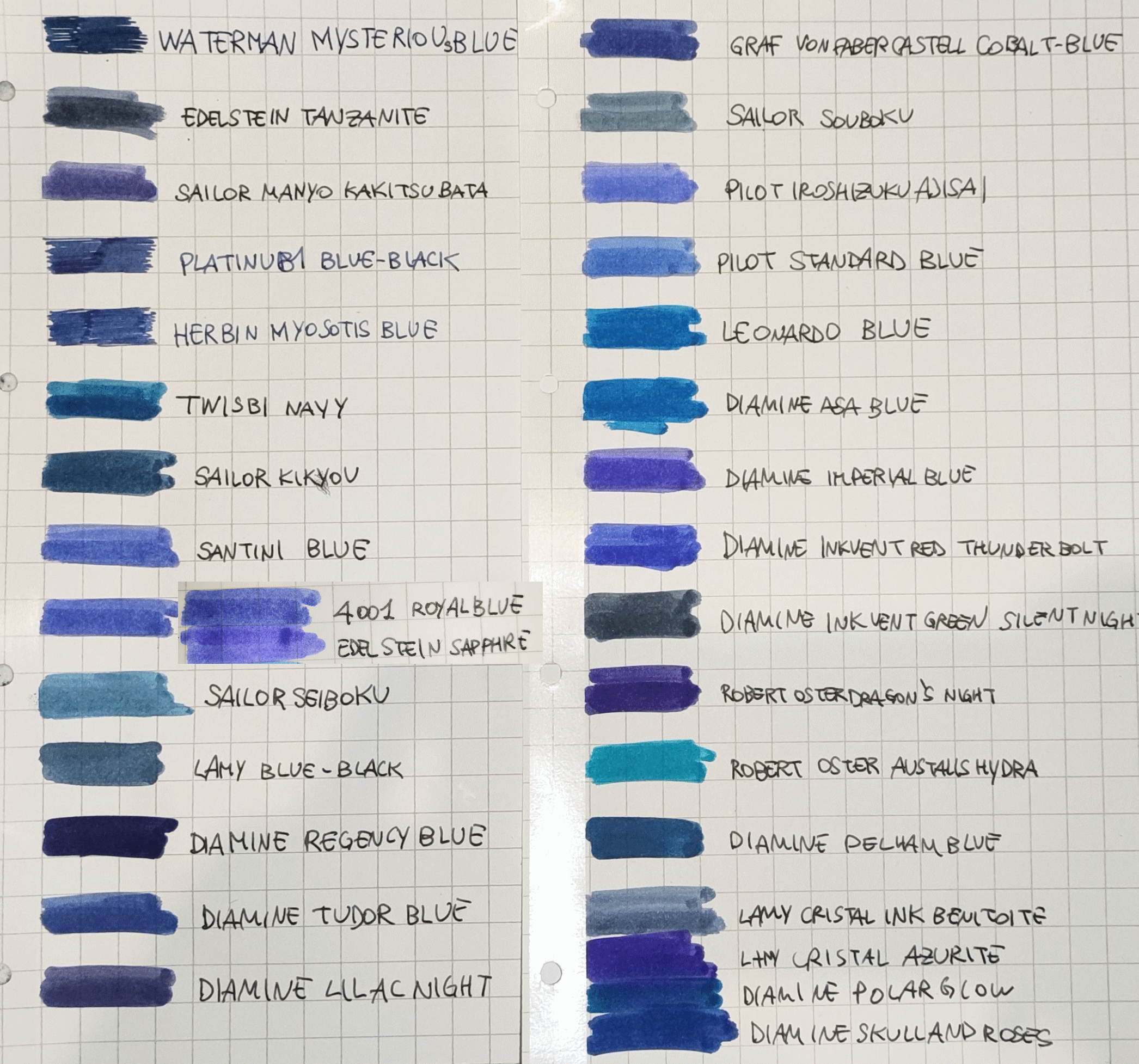 Un esempio: Herbin bleu Myosotis e Pelikan royal blue con alcune penne in cui li ho provati entrambi risultano molto più simili, addirittura con la Pelikan M150 sono quasi indistinguibili.