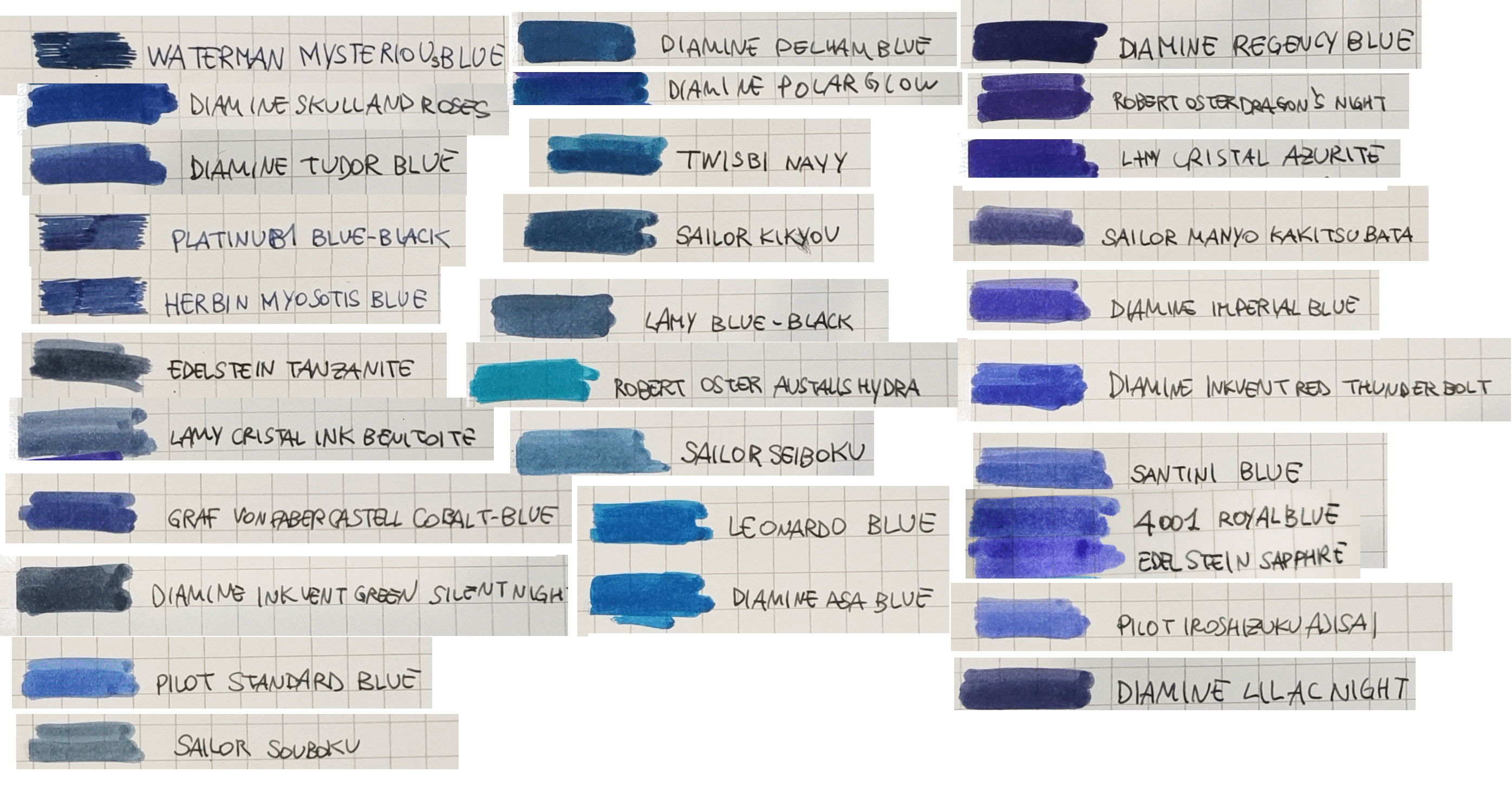 Ecco, se ti devo fare un appunto (avendo tutti questi blu ed essendoti messo di buzzo buono a fare il confronto), senza pretendere una disamina più dettagliata inchiostro per inchiostro (sarebbe stato eccessivo), è che sarebbe stato estremamente più utile per ciascun inchiostro scrivere almeno il nome con l'inchiostro stesso.