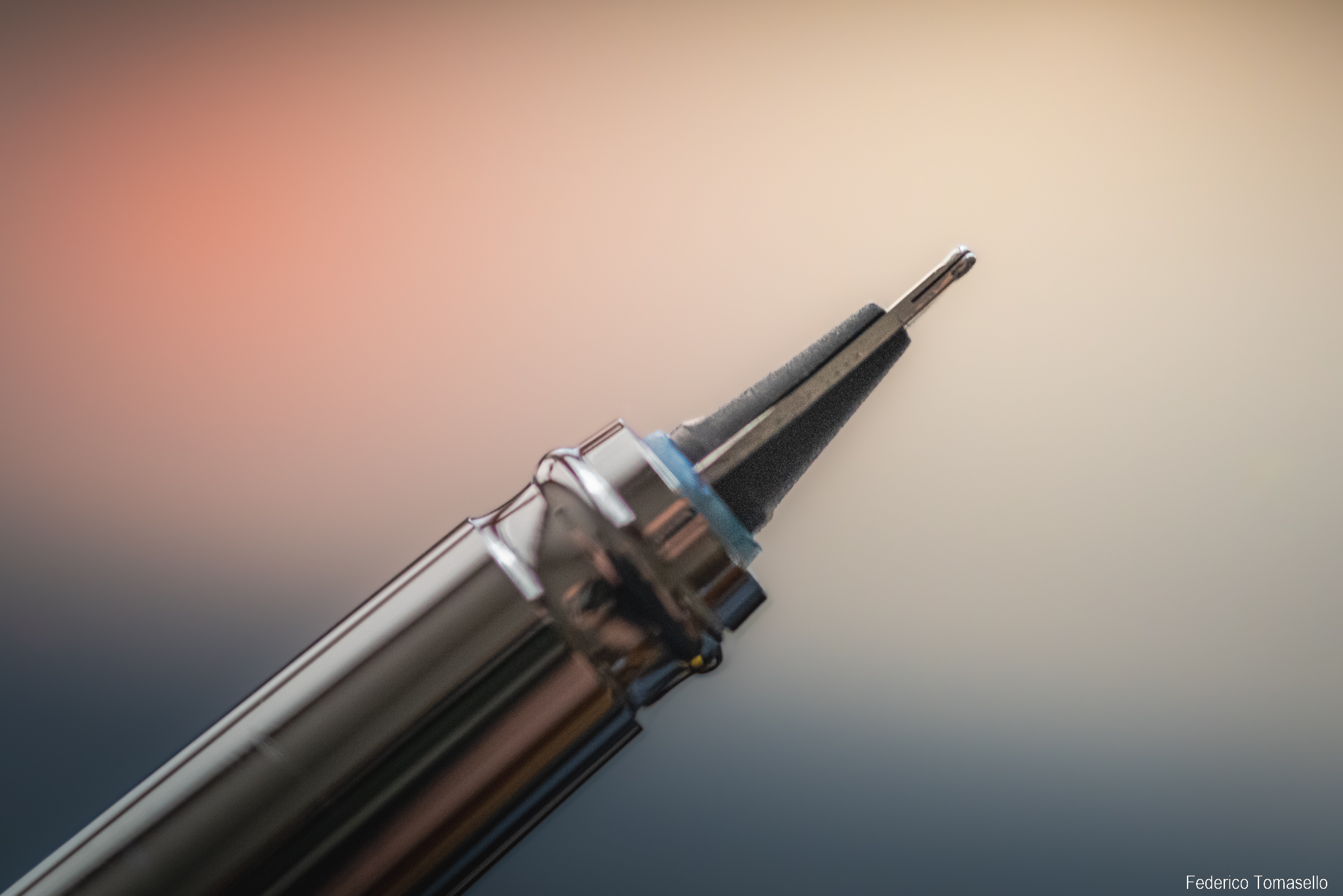 In effetti il pennino è unico e si divide in punta: a occhio nudo sembrava che lo spazio tra le due coppie di rebbi arrivasse ben più in fondo.