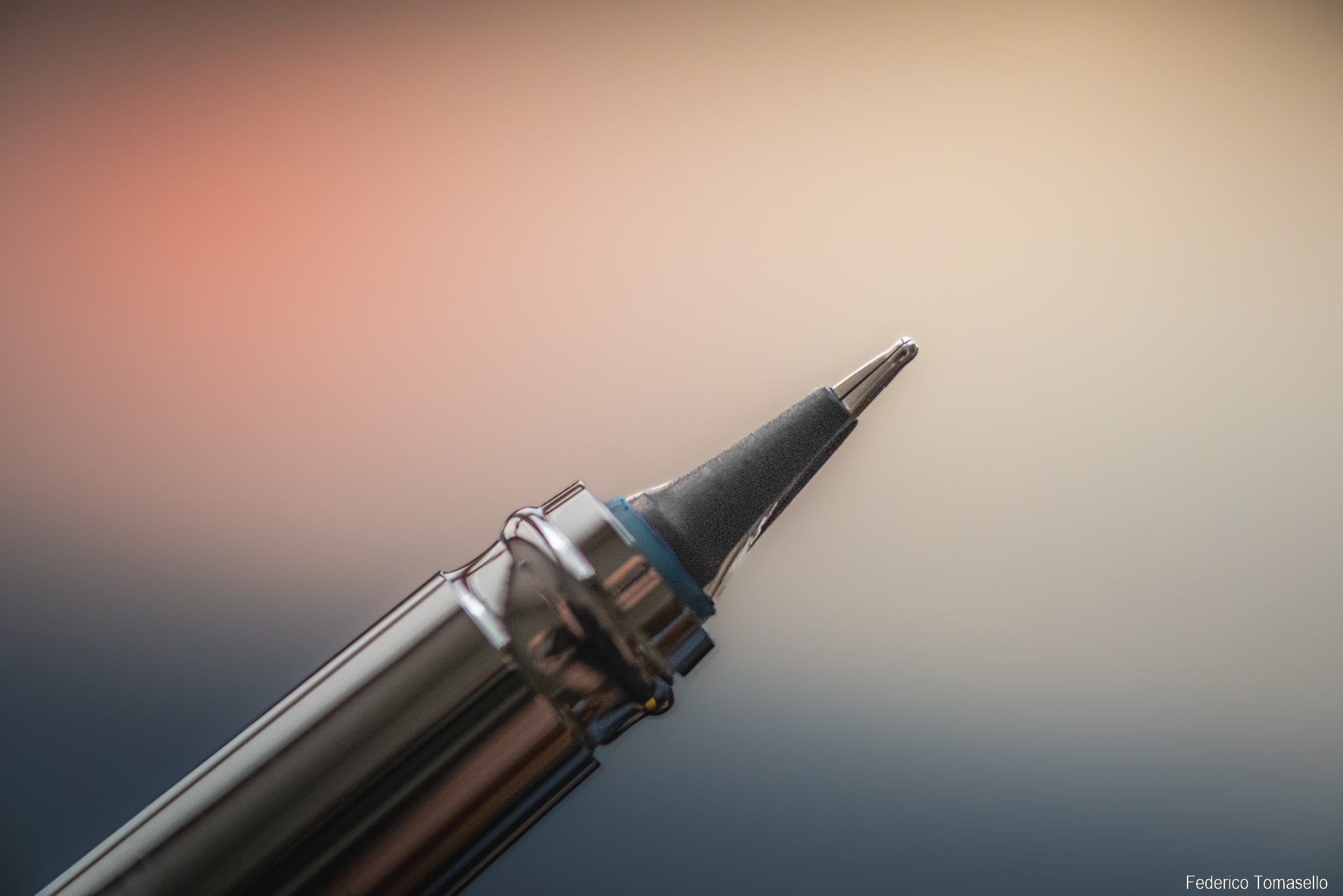 Il motivo per cui ho comprato questa penna è però il suo curiosissimo pennino "a 360°": in pratica la parte adibita alla scrittura è formata da due pennini montati in aderenza dalla parte superiore di ognuno di essi e con ciascuno alimentatore posizionato verso l'esterno; a colpo d'occhio sembra quasi una penna a sfera.