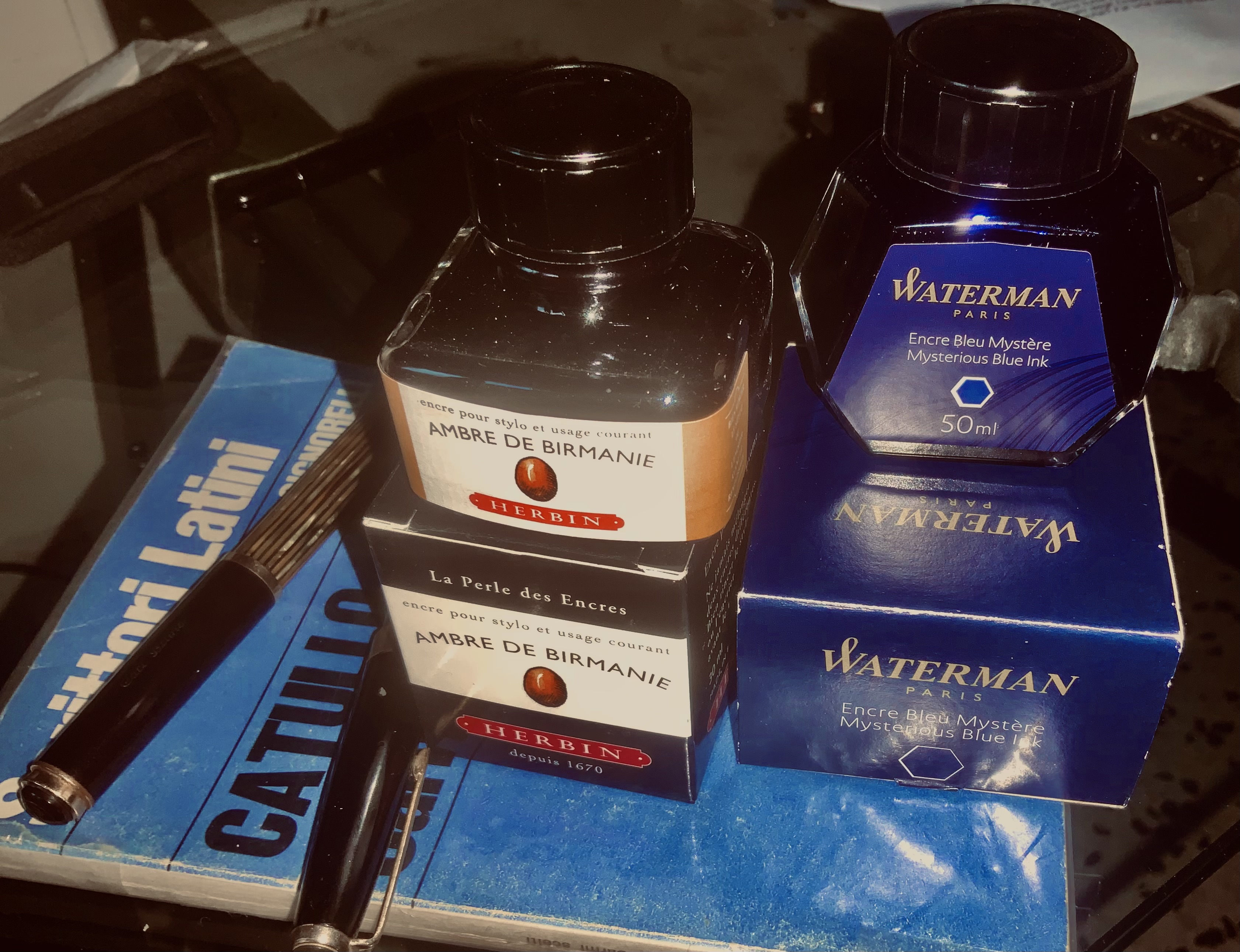 Macassar e Sargasso diamine, Verdura, Solferino e Morinda R&K, Magenta Paraphernalia… basta che siano colori squillanti e costino poco, tanto li terrò lì fino all’ultima goccia. Vabbè, nascosto dietro c’è anche il Lamy Cristal Obsidian, ma quello è per le contagocce.