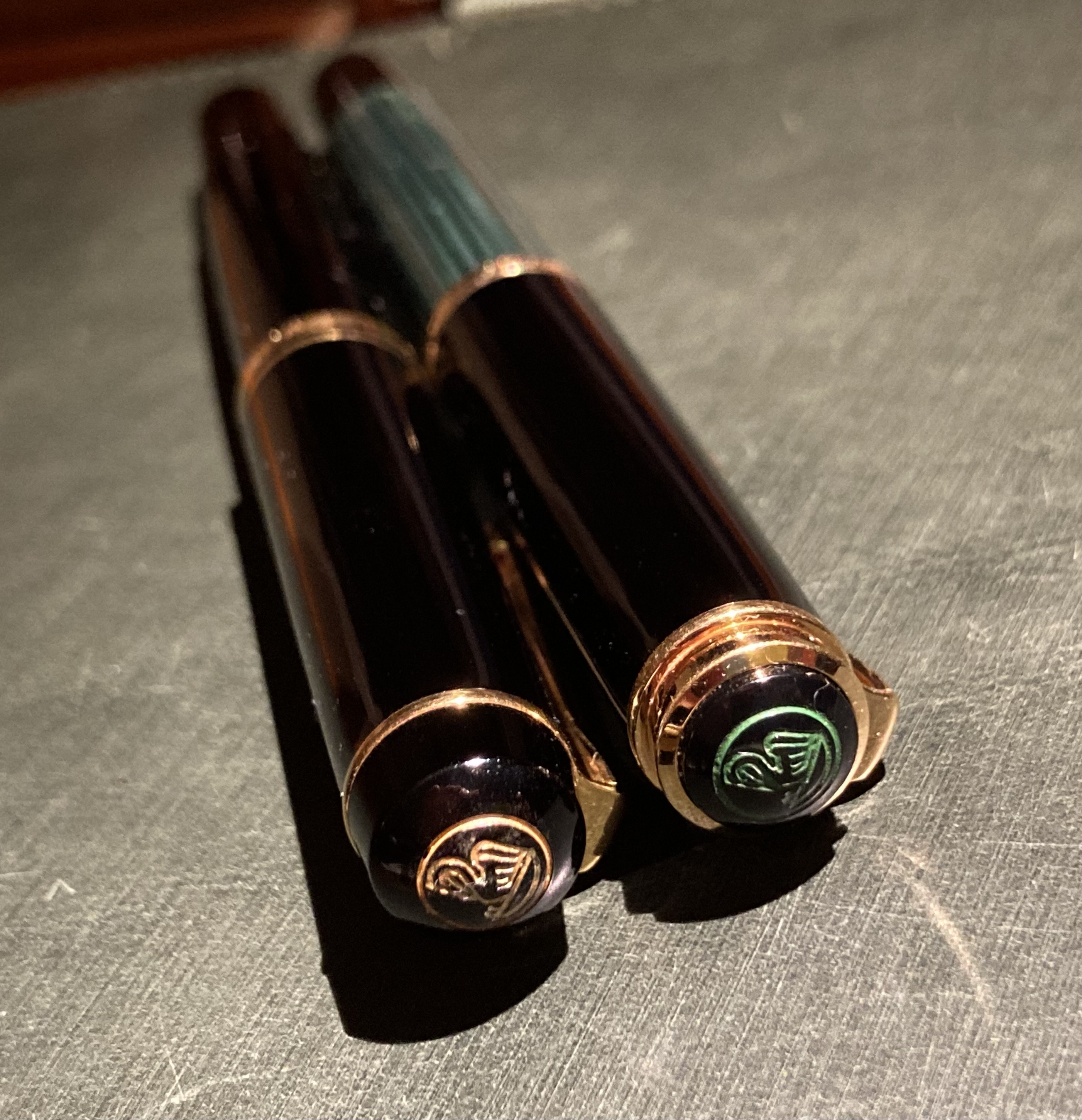 Si tratta di due Pelikan del periodo appena prima della caduta del Muro di Berlino: portano la scritta W. Germany sulla veretta del cappuccio ed appartengono a due serie di produzione diverse: la più economica, ibrida tra la M200 e la M400, si chiama M250 e pur avendo l’aspetto simile alla serie inferiore, monta lo stesso pennino della sorella all’epoca più costosa e rifinita, la M400.