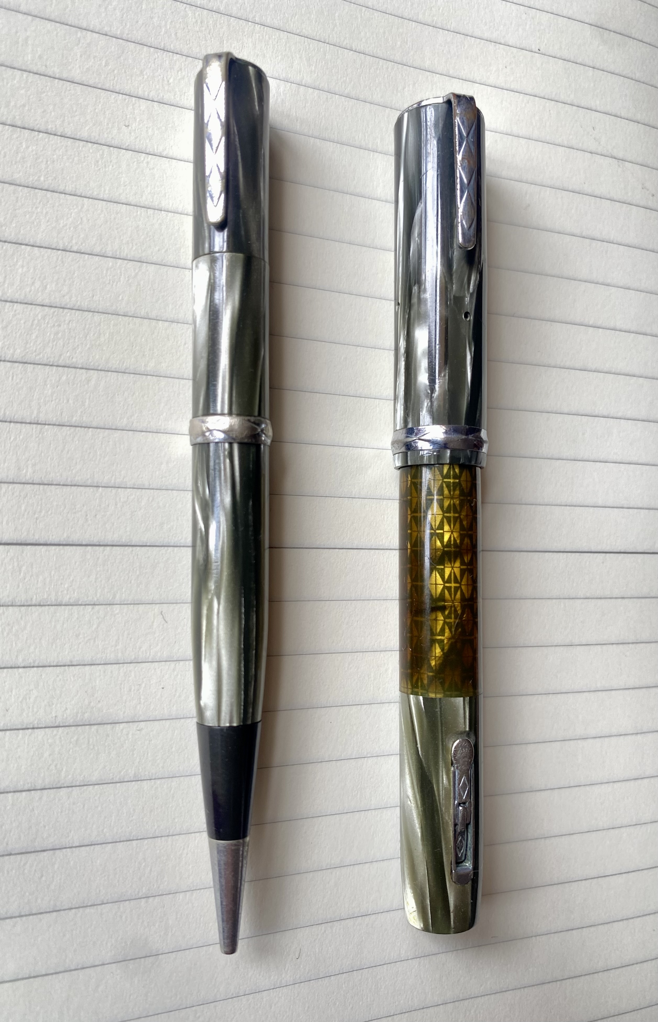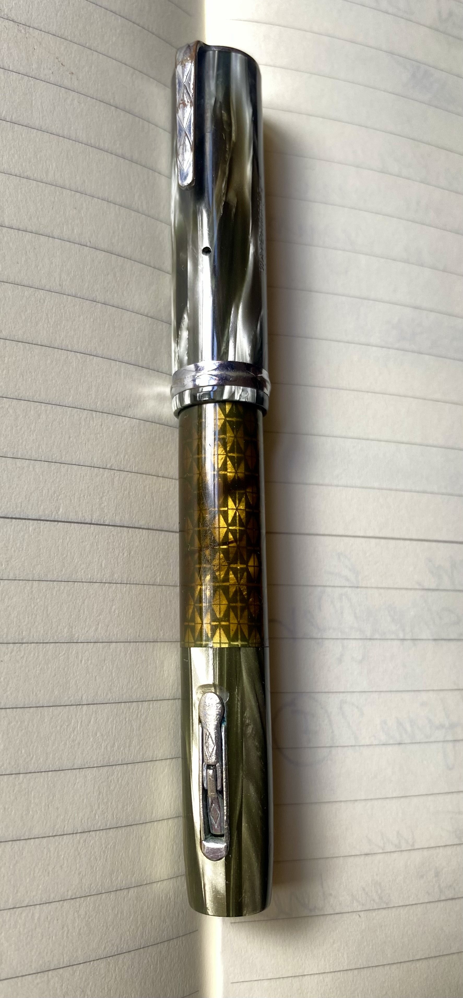 Come indicato dal catalogo waterman del 1936, il modello presentato qui è il ‘mist’ uno dei 3 colori ink-vue presenti sulle piccole lady (gli altri erano sunset e black-lace).