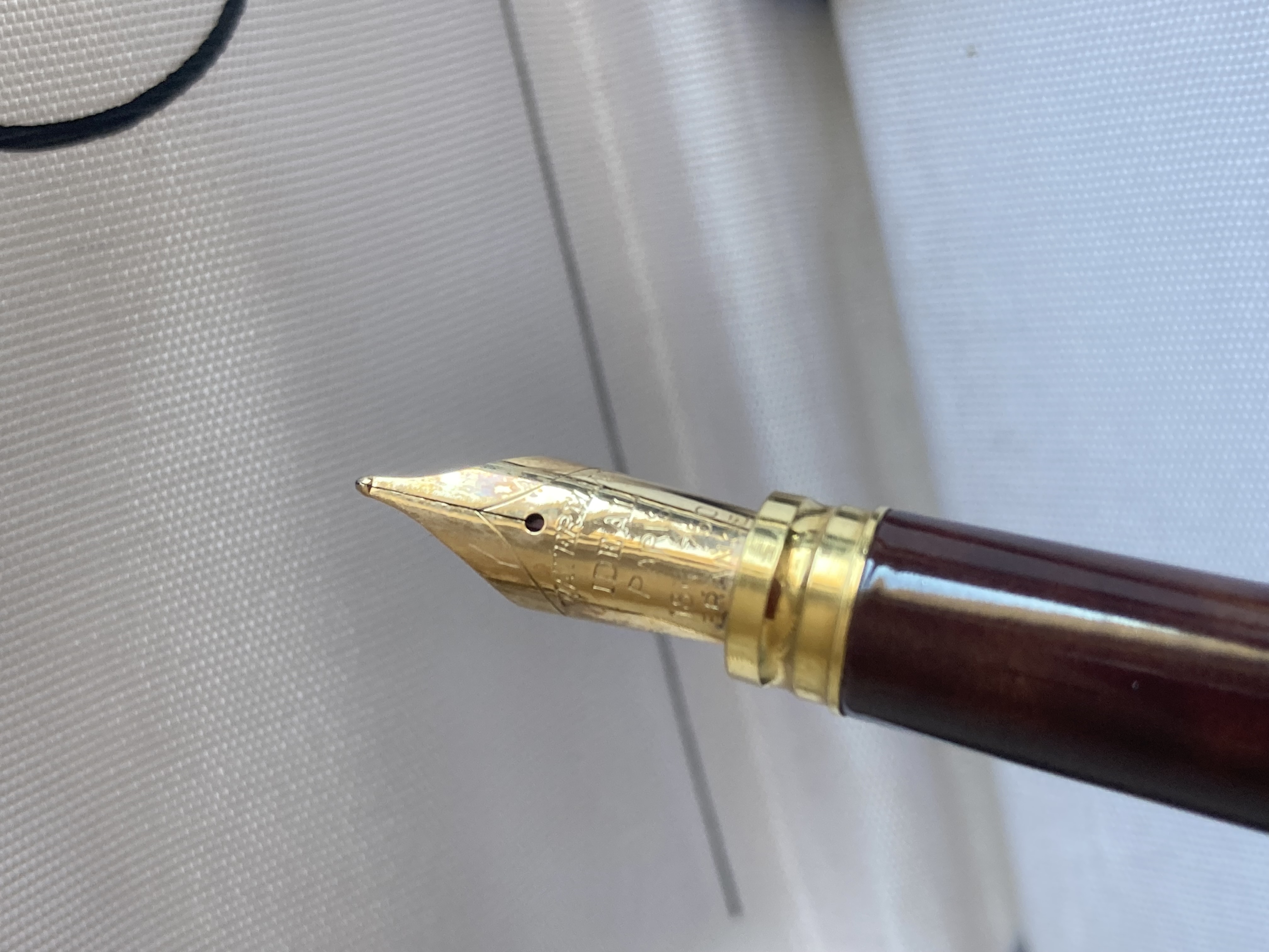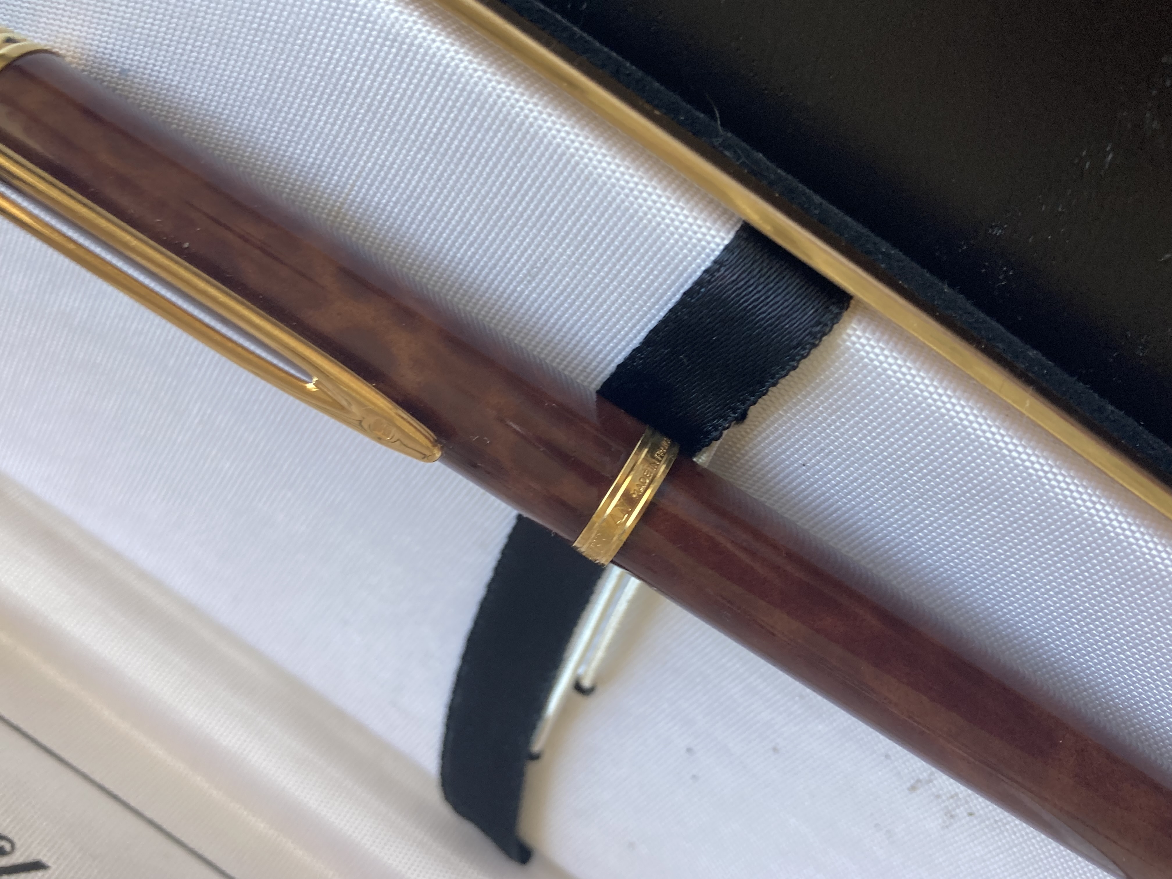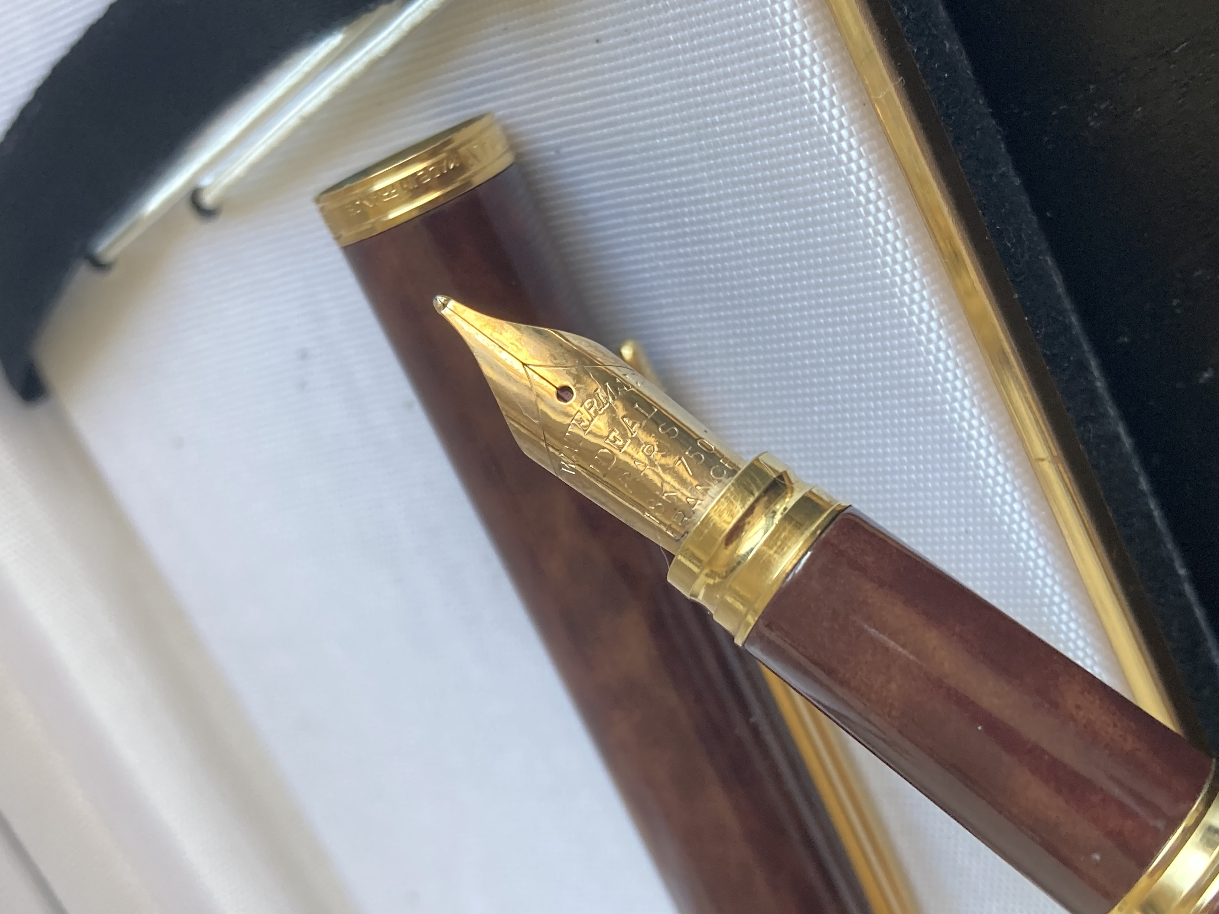 Sul pennino leggo Waterman Ideal France; il pennino è 18k. Sulla ghiera dorata nuovamente riporta il nome Waterman - credo sia una collab dato il dettaglio che vedete in cima al cappuccio.