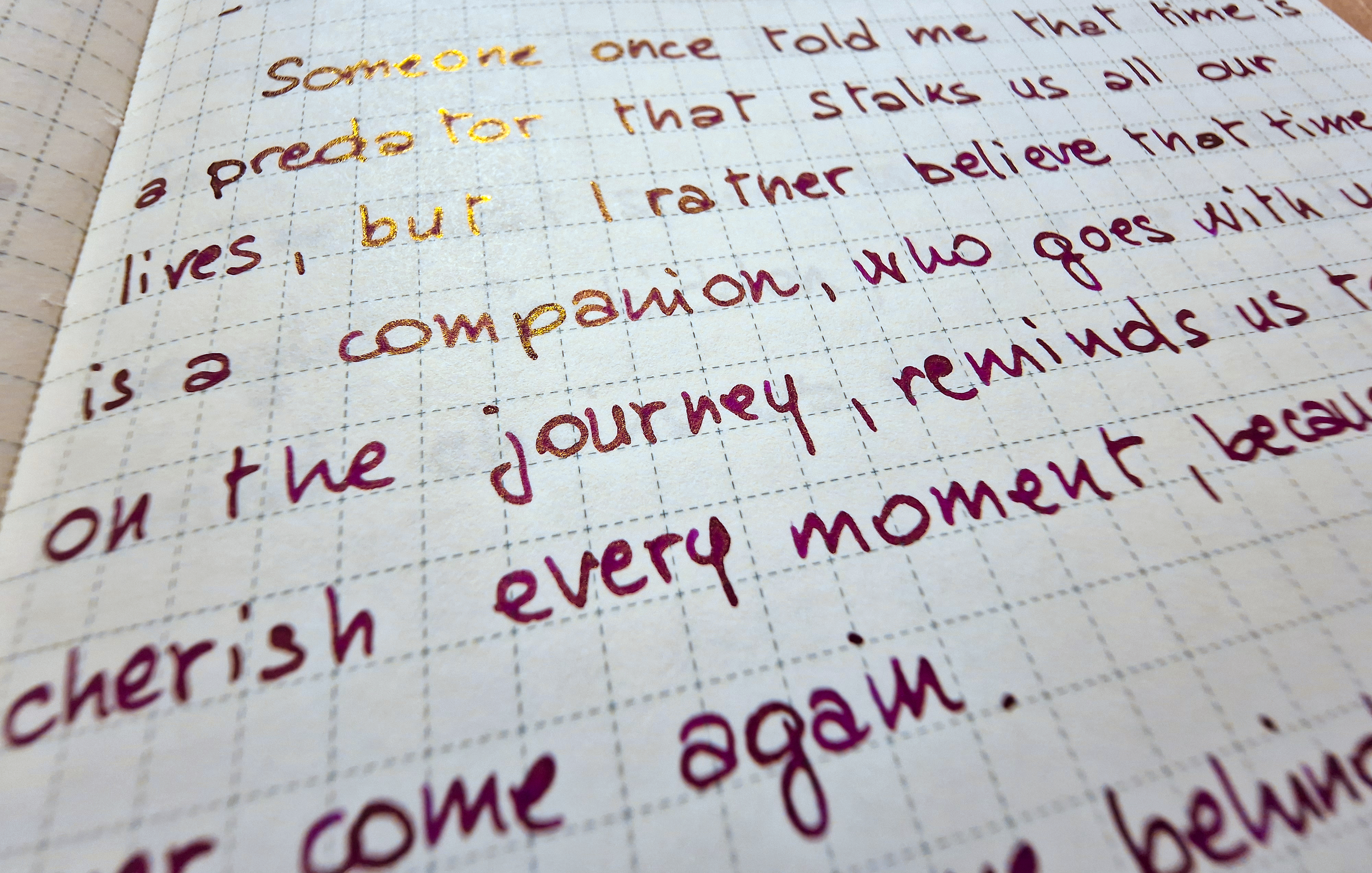 Pride and Prejudice è uno tra gli inchiostri che preferisco. Solitamente, io non amo l'oro ma il contrasto di questo luccicante metallo con il velluto porpora intenso dell'inchiostro base è uno spettacolo difficile da non voler guardare. E' un inchiostro che ho stabile da mesi in una Leonardo con pennino architect, che mi consente di godermi sia lo sheen che il velluto.