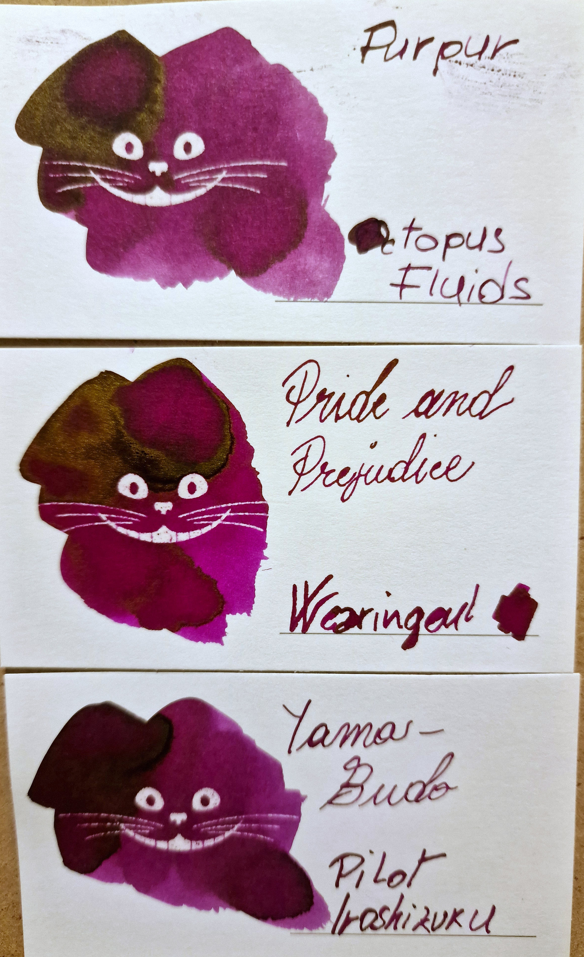 Il colore di base di questo inchiostro è molto comparabile al Pilot Iroshizuku Yama-Budo. Yama-Budo è un poco più violaceo e desaturo rispetto a Pride and Prejudice, meno vellutato e avvolgente. C'è somiglianza anche con Octopus Fluids Purpur. Questi tre inchiostri differiscono nello sheening. Purpur di Octopus Fluids ha un tipico sheen bronzo, Yama-Budo ha uno sheen che tende di più al verdognolo.