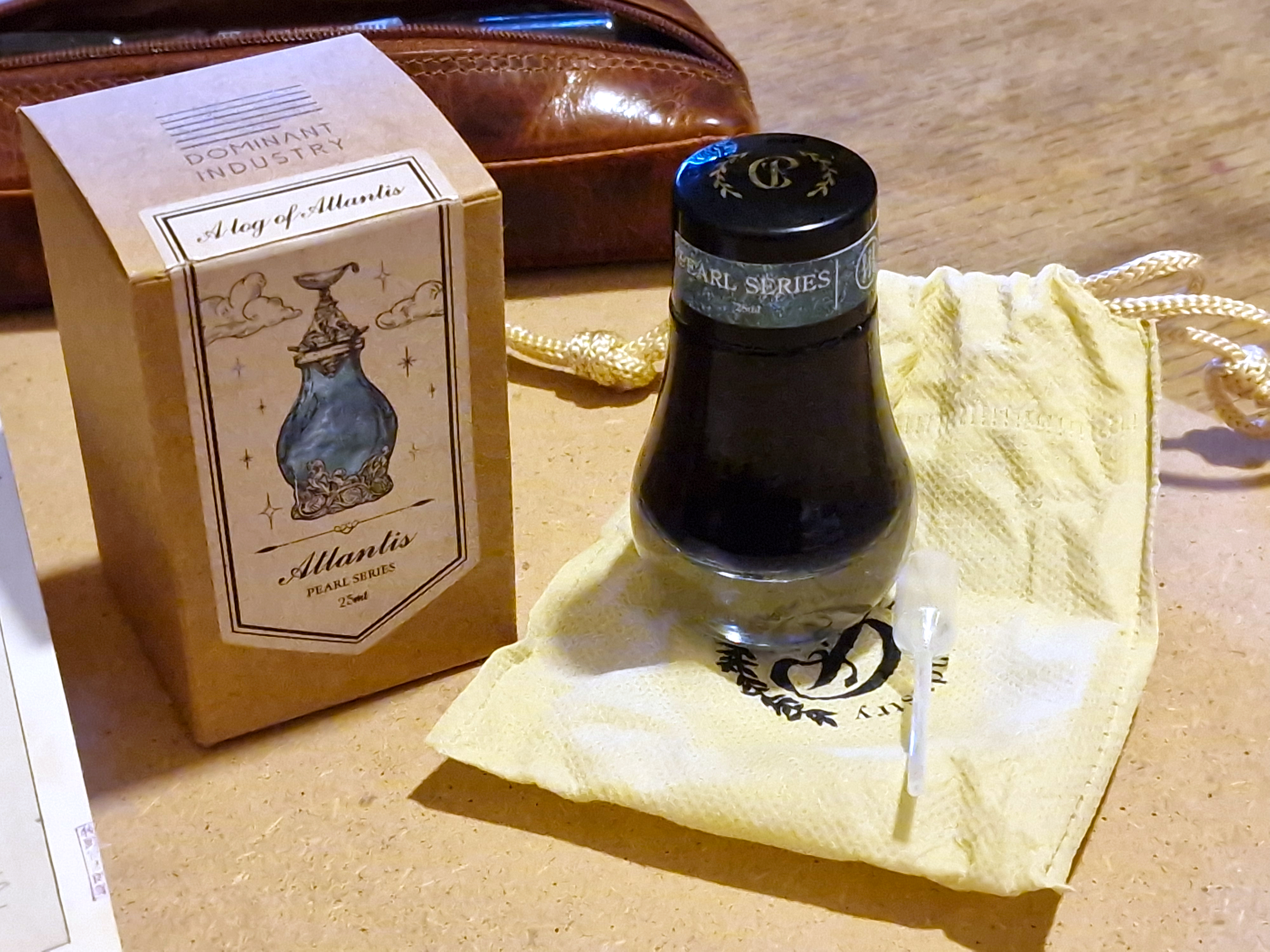 Dominant Industry Atlantis è un inchiostro molto recente, lanciato sul mercato circa un mese fa per una collezione limitata chiamata "Log of Atlantis" (il diario di Atlantide). La collezione include: due inchiostri, Atlantis e Seaweed; un timbro in legno che stampa un adornato flacone di inchiostro, lo stesso che si vede sull'etichetta della scatola; un libro da colorare che funge anche da sistema di archiviazione e swatching dei propri inchiostri.