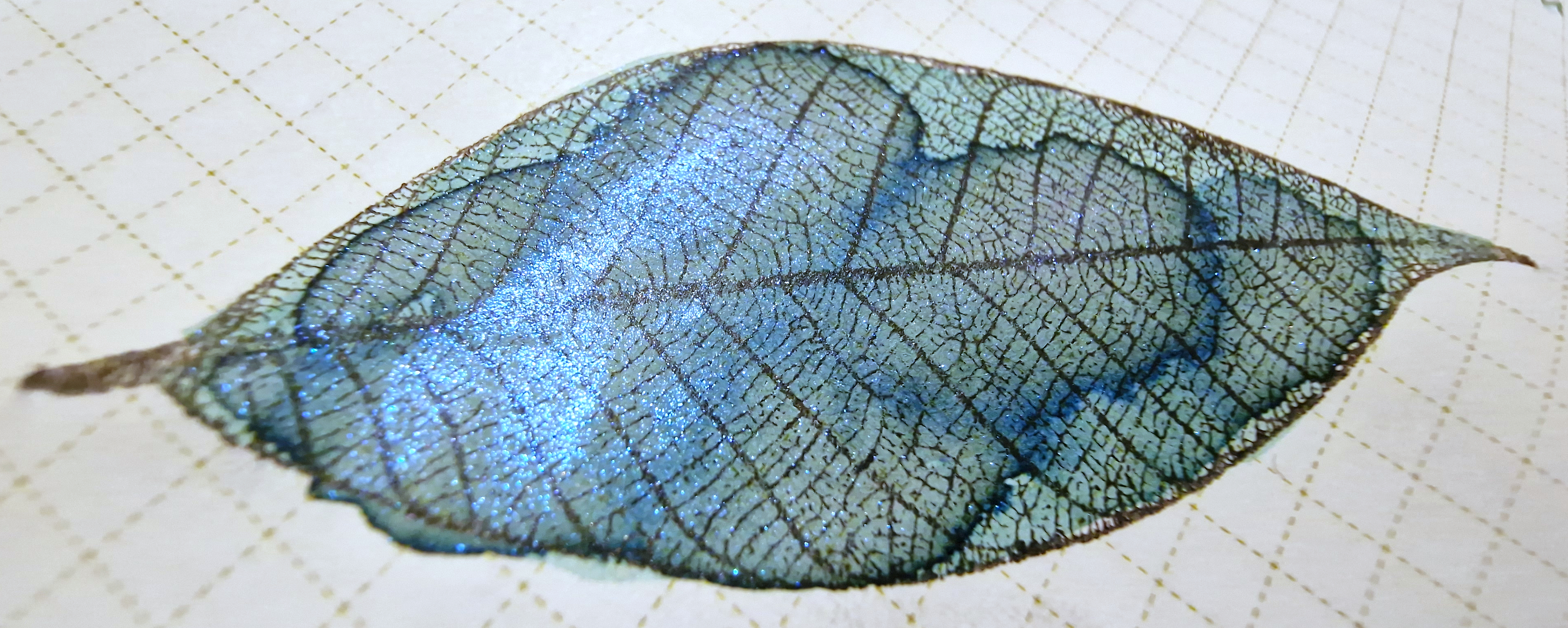 A me, questo è un colore che piace moltissimo. E' un verde senza essere troppo verde, sulla pagina si legge molto bene, più di Goryeo Celadon, che resta vicino al trasparente. Lo shading che fornisce è delizioso e il glitter blu ricorda i riflessi del mare.