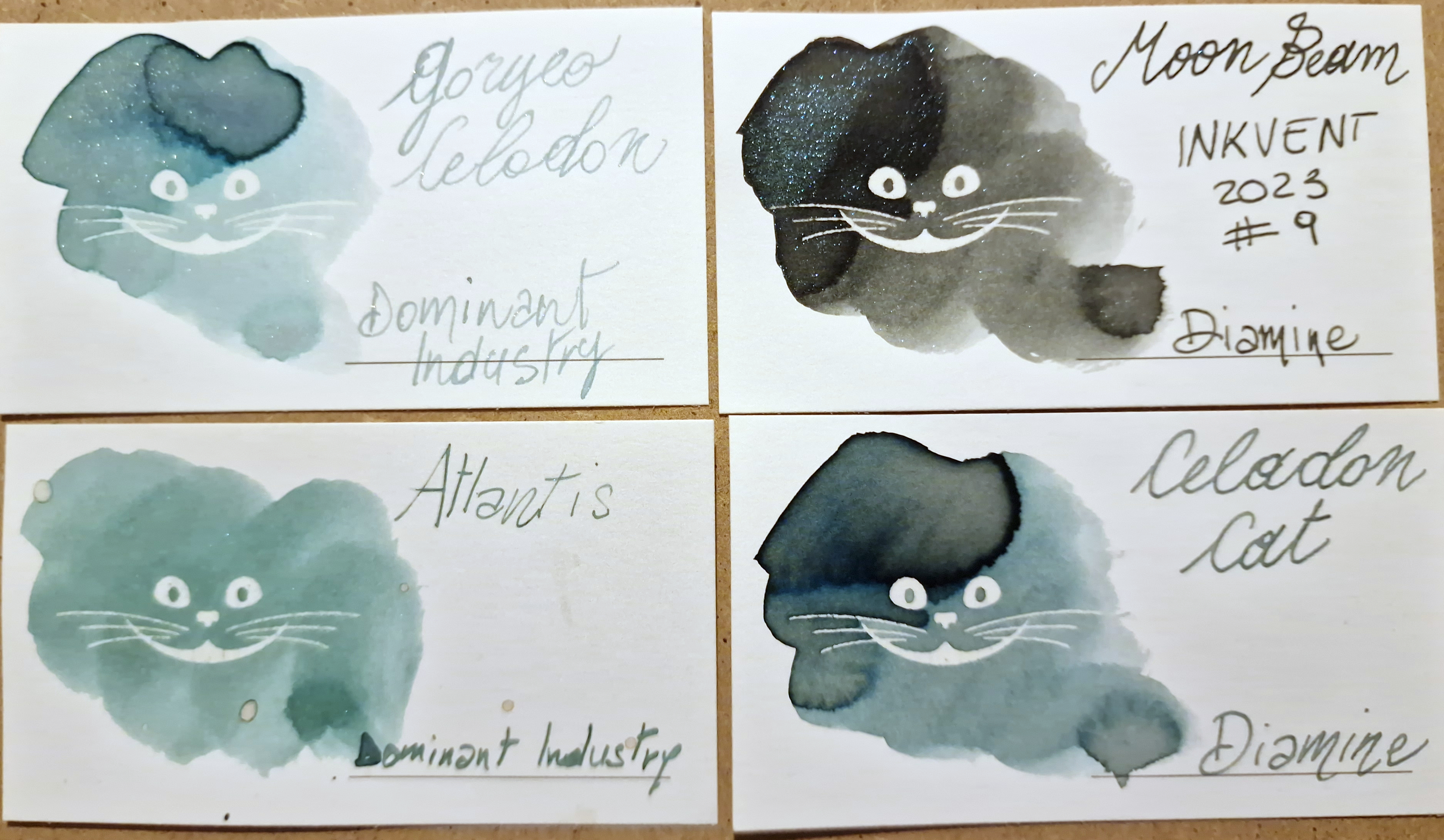 L'altro è Celadon Cat di Diamine. Celadon Cat è un poco più scuro e leggermente più grigio. Sono, tuttavia, strettamente imparentati, questi tre inchiostri.