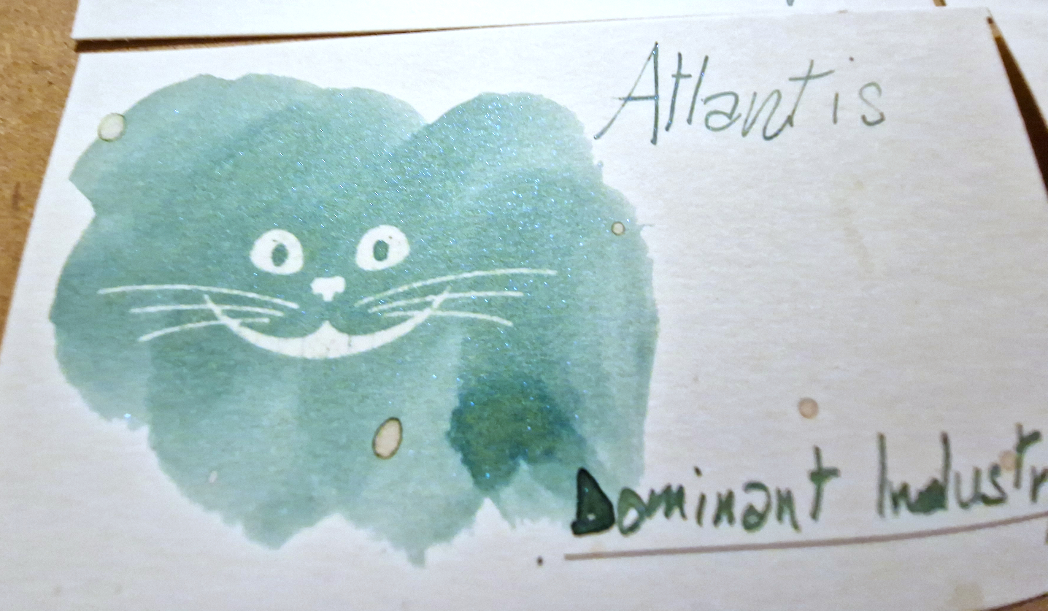 A chi non lo consiglio: come al solito, non lo consiglio a chi non ama gli inchiostri shimmer ma, come sempre, basta non agitare il flacone e lo shimmer se ne starà al suo posto in fondo al vaso; a chi cerca colori intensi; a chi già ama Celadon Cat e se n'è fatto scorta. Atlantis è diverso da Celadon Cat, quanto basta da vedersi che è un diverso inchiostro, ma non tanto da renderlo irrinunciabile per chi è già sceso lungo questa china con Diamine.