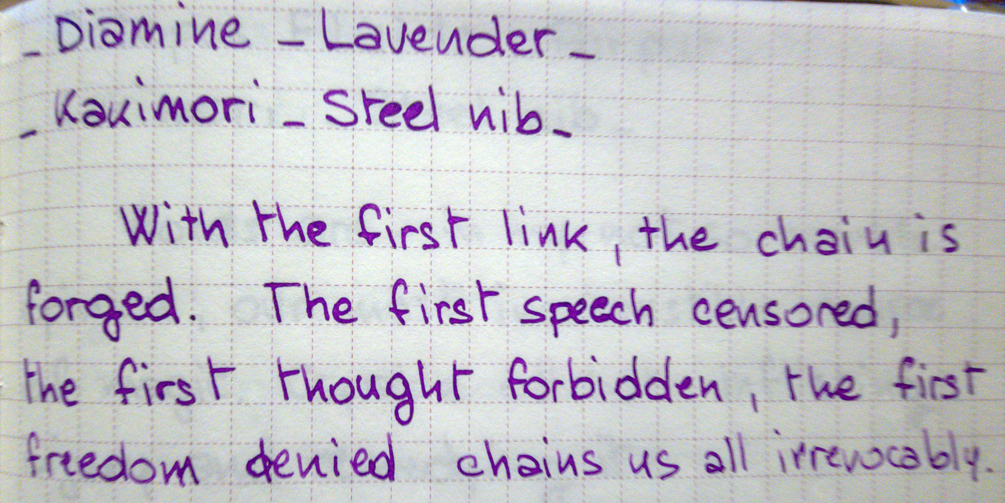 Lo metterei a braccetto con inchiostri come Aqua Lagoon [QUI: viewtopic.php?t=32995], se non fosse per una differenza sostanziale: è viola e io tendo a essere estremamente più tollerante e parziale verso i viola. Va detto, tuttavia, che è sicuramente uno dei miei viola che meno apprezzo. Nonostante questo, se dovessi buttarne uno giù da un ponte, non sarebbe Lavender a fare quella fine