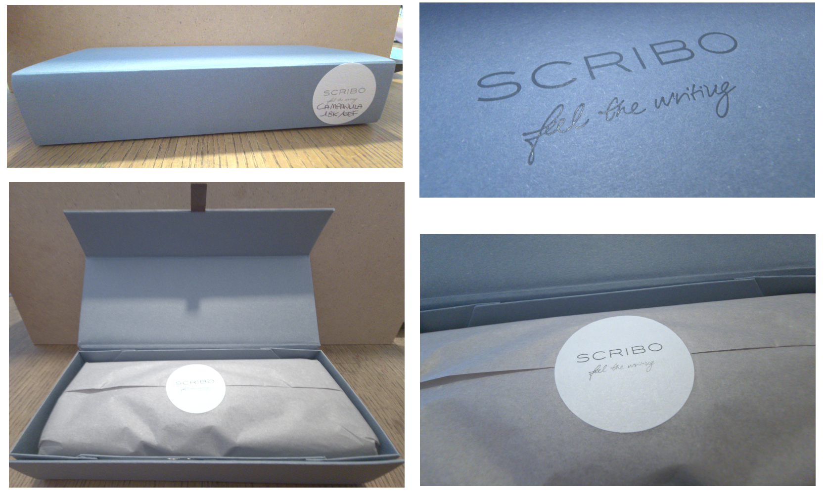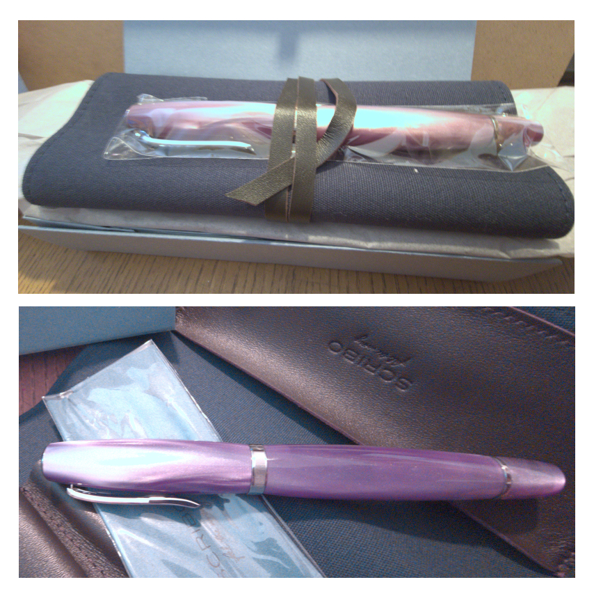 La penna, all'interno, è avvolta da carta velina e tenuta in sede dal laccio di un astuccio portapenne, fatto di tessuto, con chiusura a rotolo. Il mio è in colore blu, con inserti e laccio in vera pelle color caffè. Non so se ci siano variazioni di colore del portapenne in altri modelli.