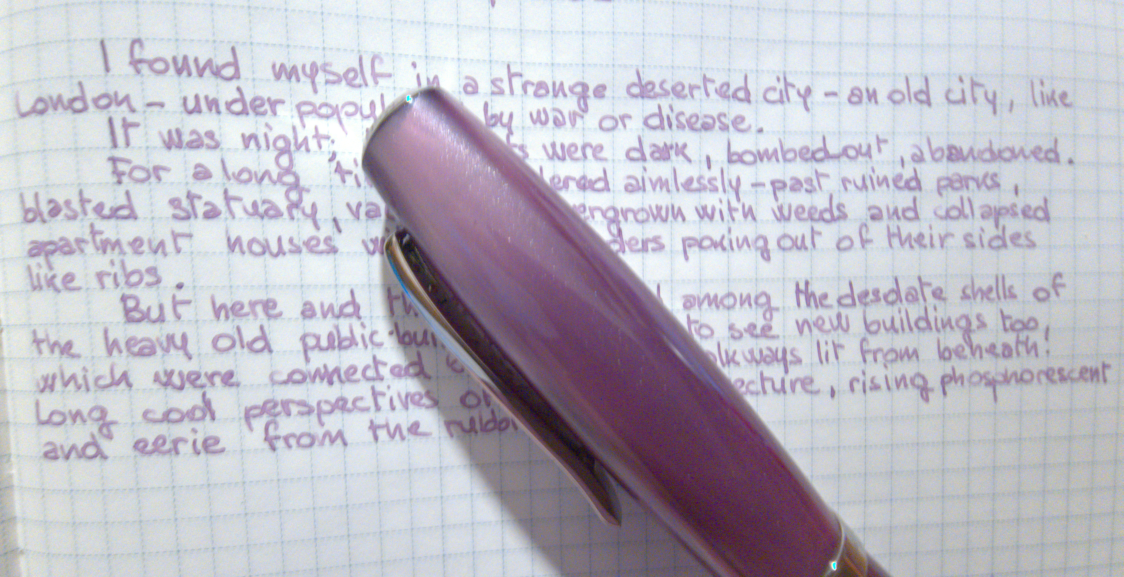 Per quanto riguarda la scrittura, avevo letto che l'EEF avrebbe potuto avere necessità di un breve rodaggio, prima di funzionare al meglio, tuttavia, sono stata fortunata e non ho ravvisato alcun problema: è perfettamente tarato appena uscito dalla scatola. E' un pennino bagnato, per essere così fine, sicuramente complice anche l'inchiostro che ho usato, che è un poco sbrodoloso di suo: Schneider Pastel Lilac. E' il suo, quasi identico al colore della penna.