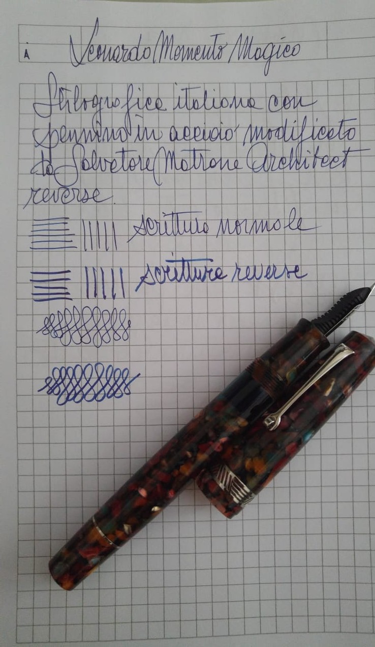 Il pennino Architect funziona all’opposto rispetto al CSI: invece di “incicciottire” le lettere, le slancia e smagrisce. Il funzionamento, però, è molto legato all’inclinazione della penna sul foglio e, se tieni la penna più verticale o orizzontale sul foglio potresti sentir grattare (come con un italico)