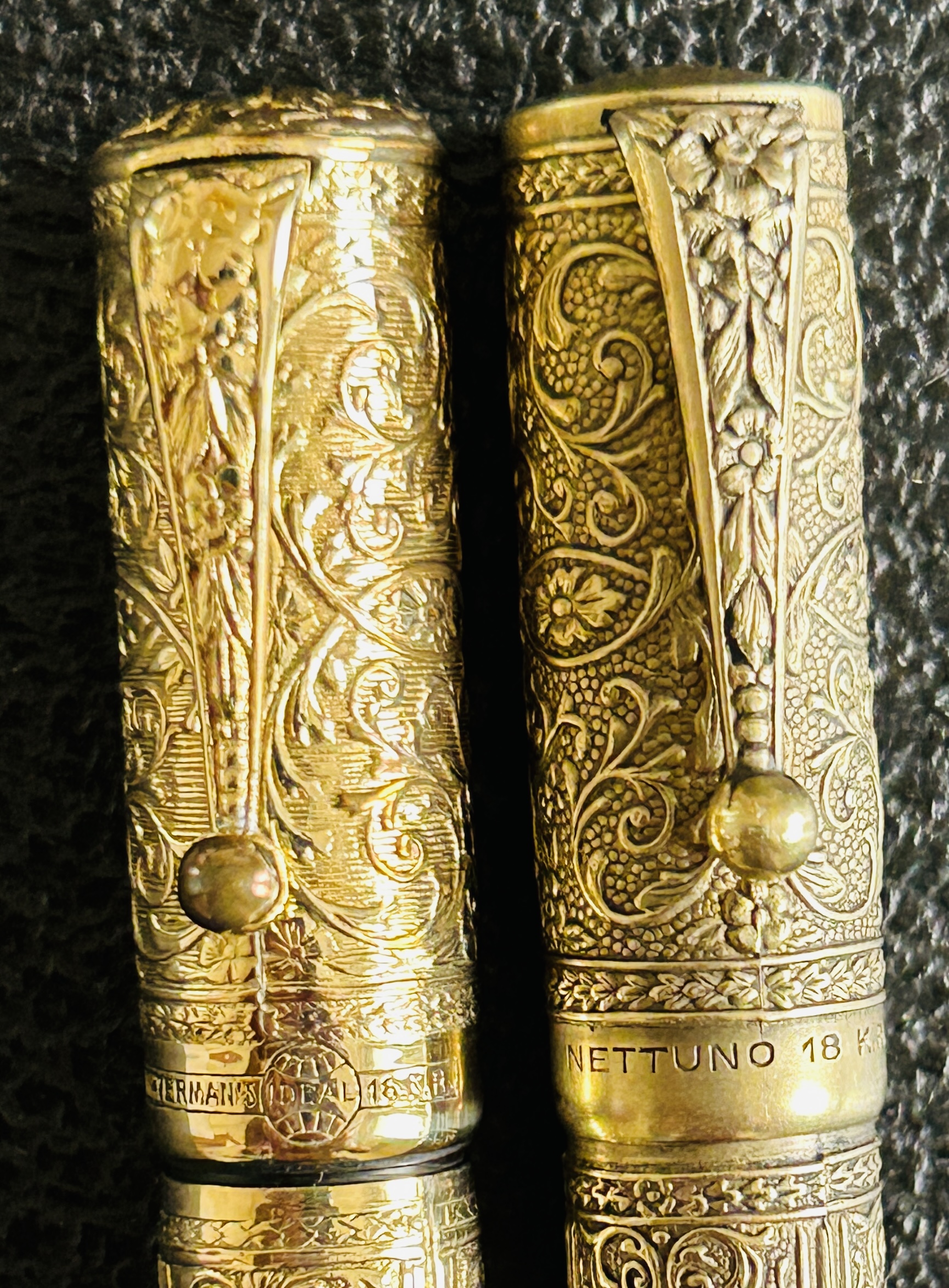 In questo caso, a sinistra un esemplare di Waterman's Pompeiana uscito dal laboratorio dei F.lli Cavaliere e commissionato all'artigiano Luigi Mazza, mentre a destra un esemplare simile "firmato" però NETTUNO.