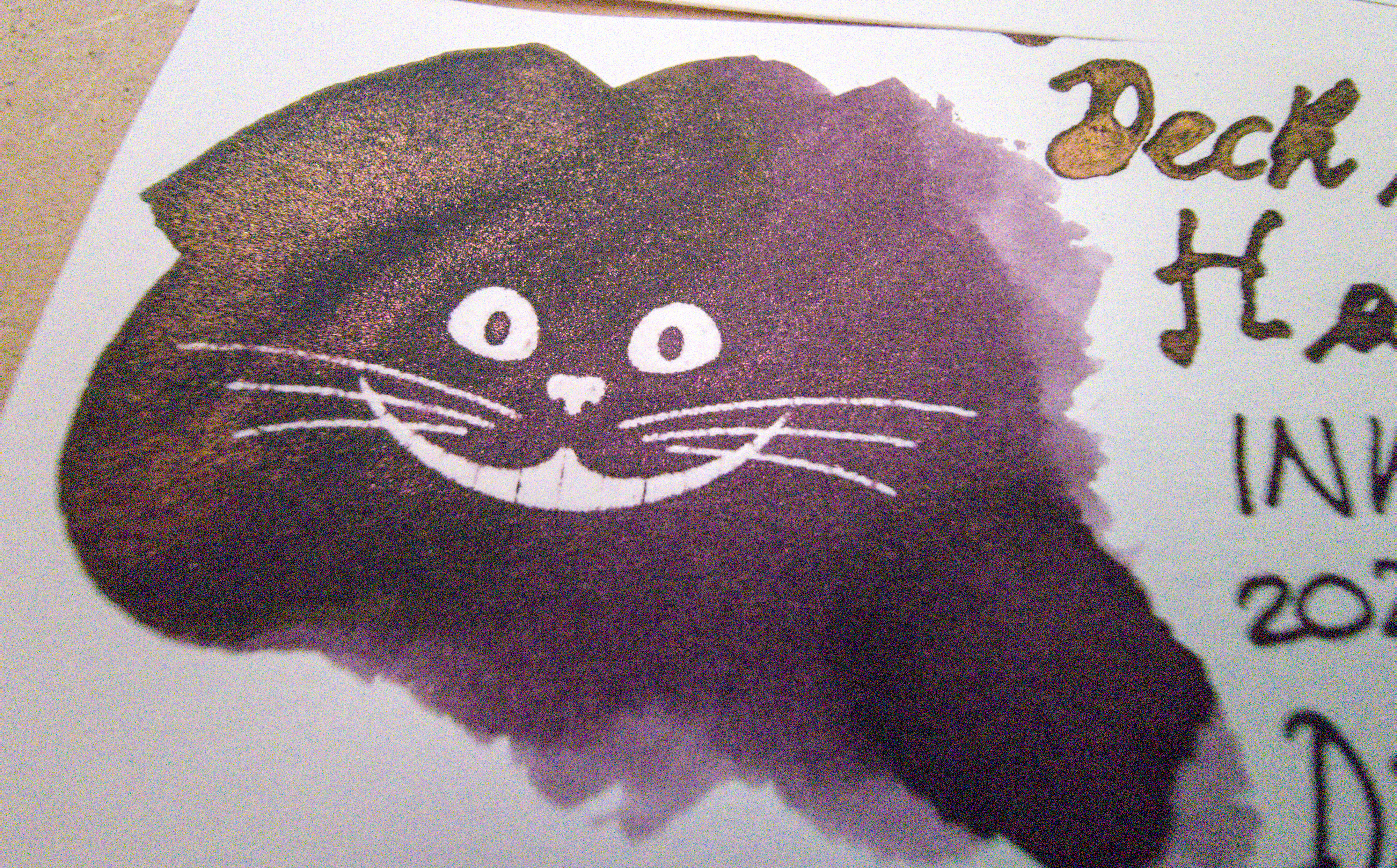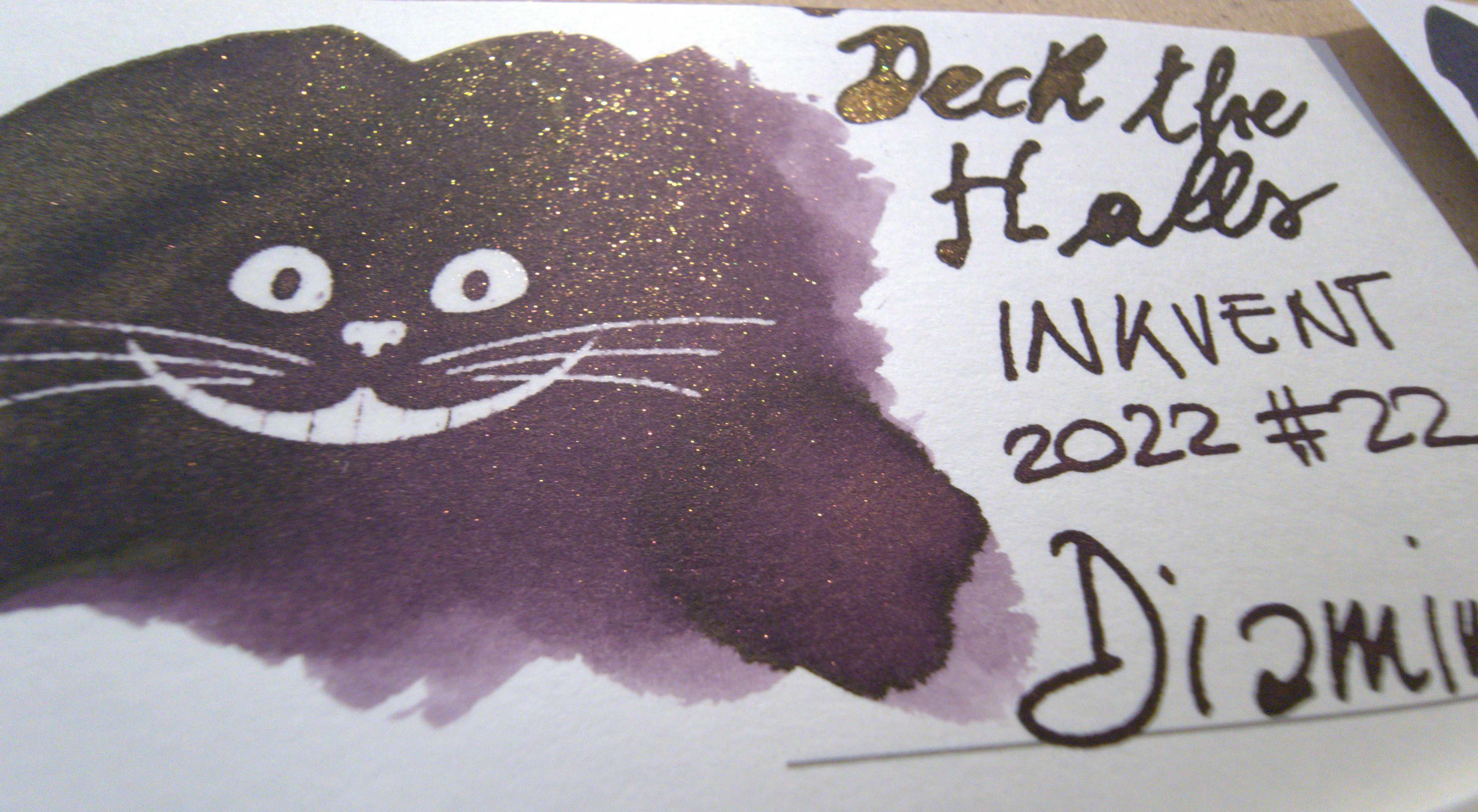 Deck The Halls fa parte della collezione Inkvent Green del 2022, è un inchiostro di una categoria chiamata "Chameleon". E' un viola caldo, scuro, desaturato. Non ha shading, non ha chromashading, non ha sheen. Ha glitter duochrome oro/fuchsia.