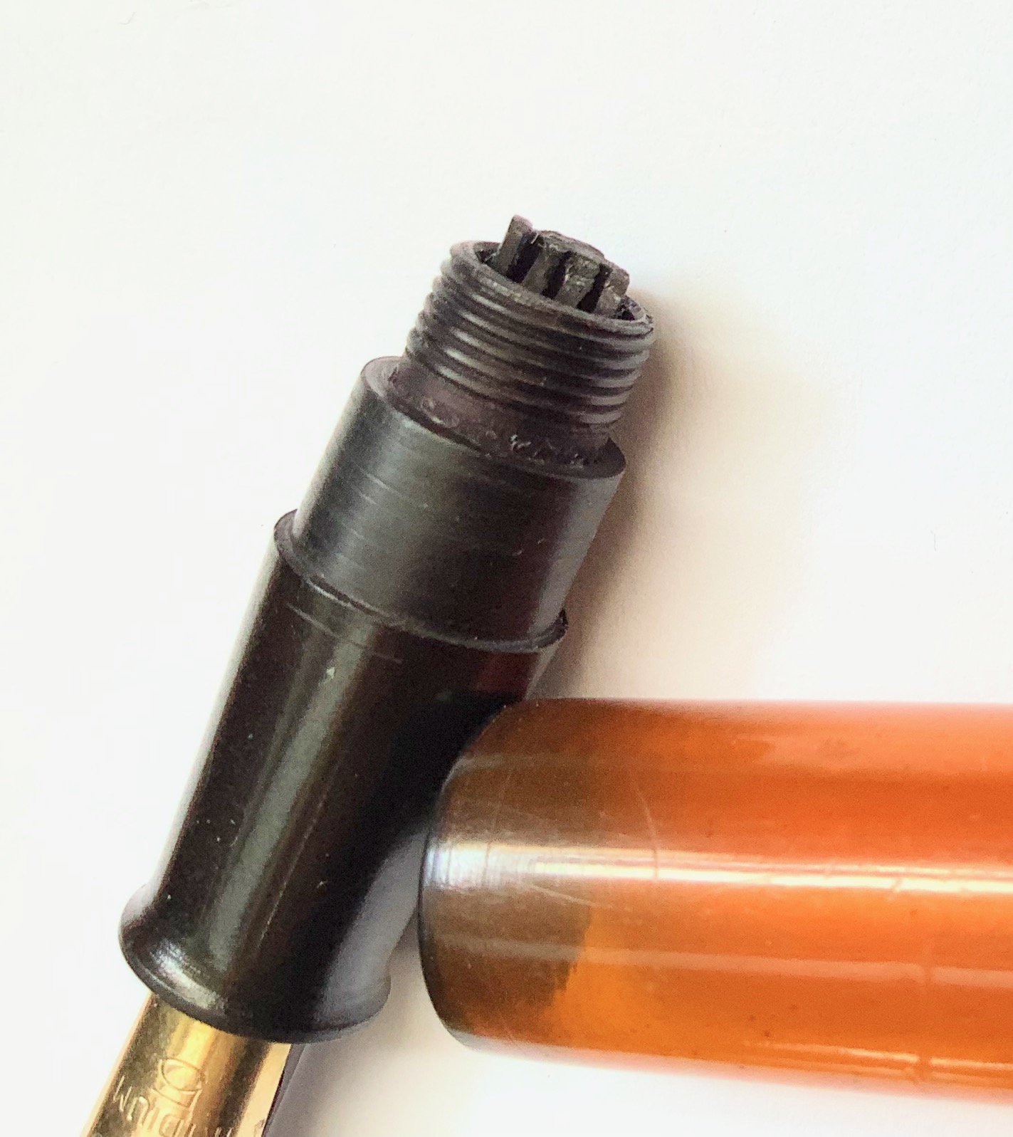L'alimentatore , spezzato , che sporge dal collare della sezione. Si notano gli intagli dei tre canali. Questo alimentatore veniva chiamato coda di rondine ed identificava anche il tipo di penne con questo sistema di caricamento