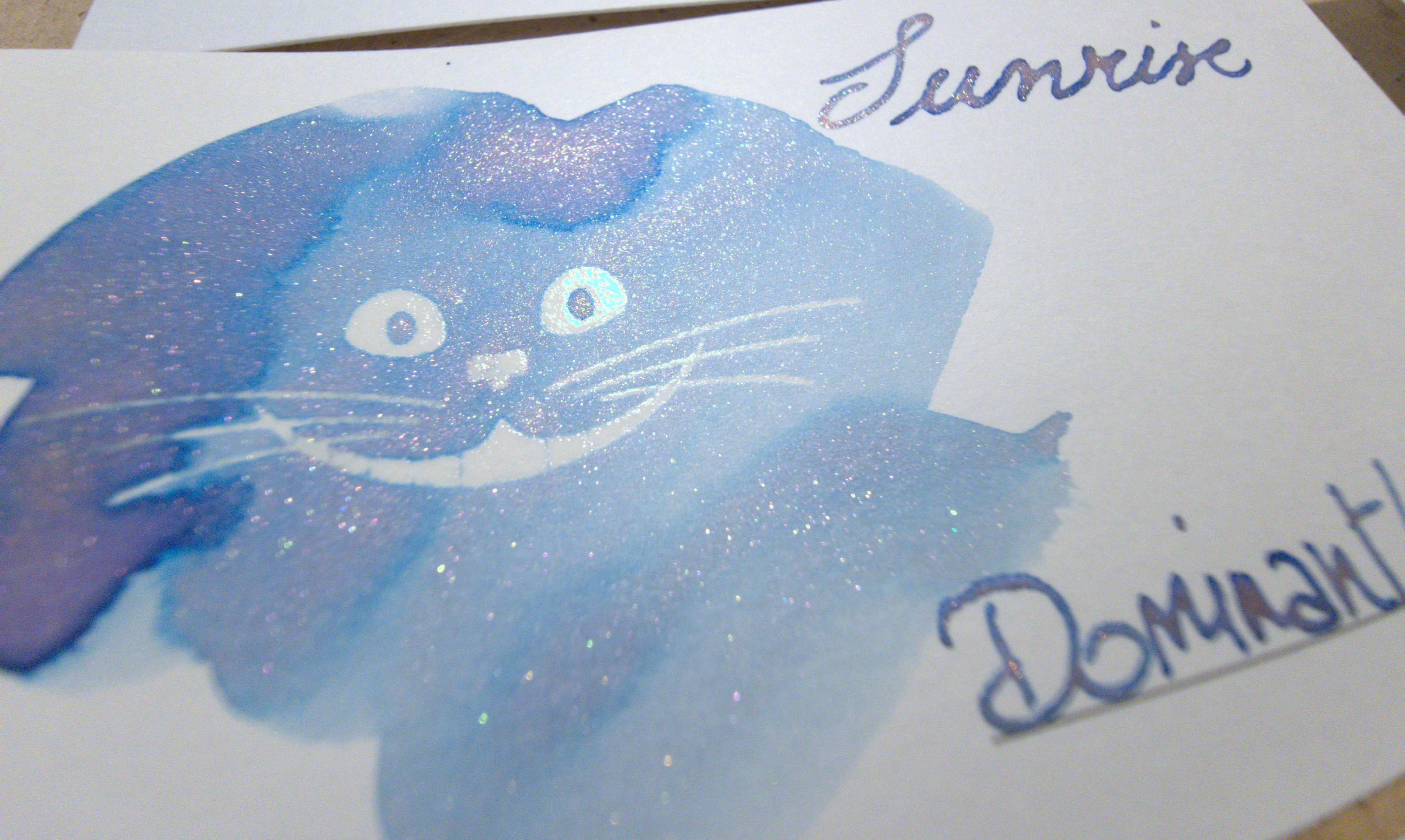 Sunrise è un blu chiaro, neutro con sottotono caldo, con medio shading, moderato chromashading, nessuno sheen. Ha fine glitter ramato.