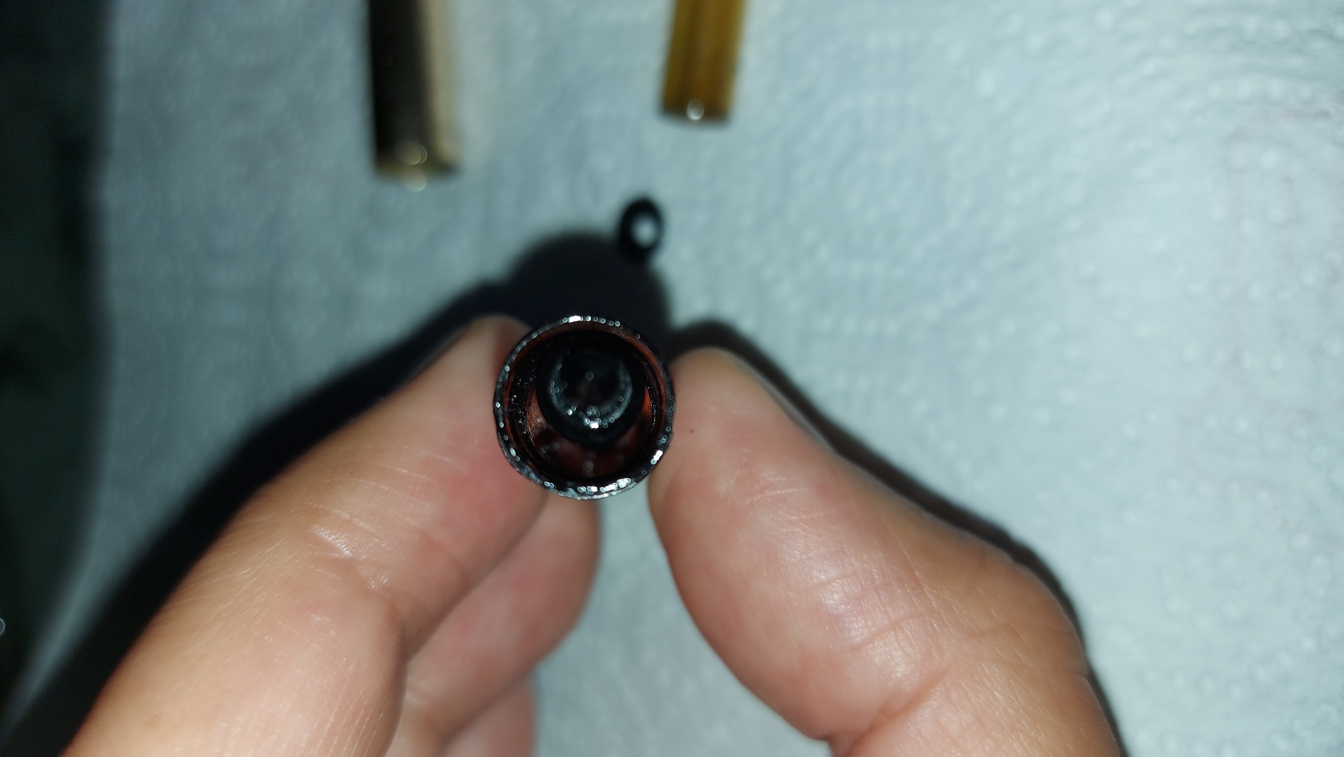 guardando dentro vedo che dietro il cilindretto con pinta conica c'è un dischetto più grande ma non capisco se è la chiusura del serbatoio marroncino o se è una ribattuto per bloccare la guarnizione. In fondo si vede qualcosa di arancione, ma dovrebbe essere la guarnizione della tenuta del fondo.
