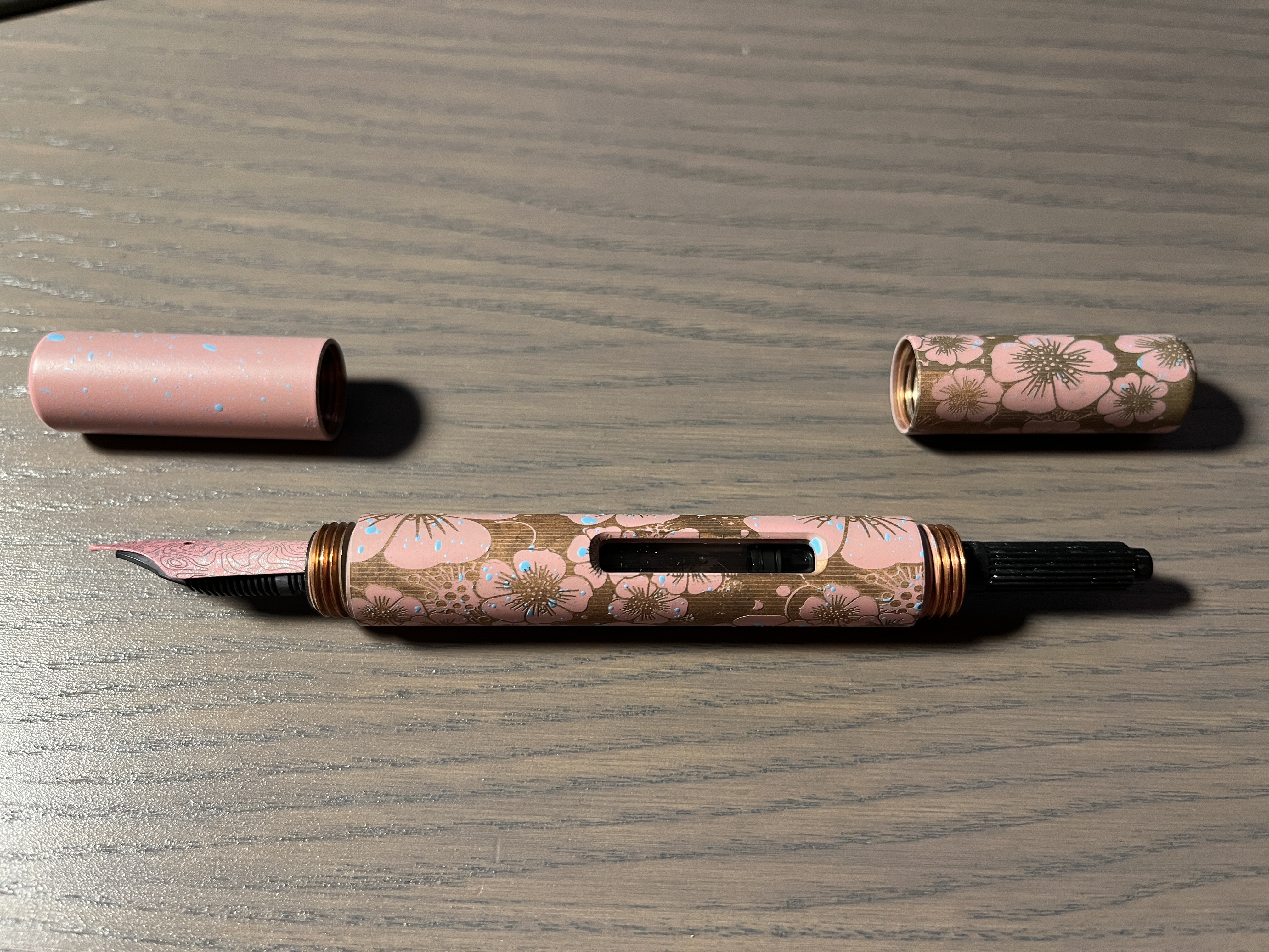 Il pennino è completamente rivestito dallo stesso film ceramico del corpo, quindi è logicamente un po' diverso da uno standard, ma scrive bene lo stesso, forse un po' meno bagnato - in ogni caso la mia monta un Bock #6 M, e non un JoWo e un po' meno bagnato per un Bock non è nemmeno male.