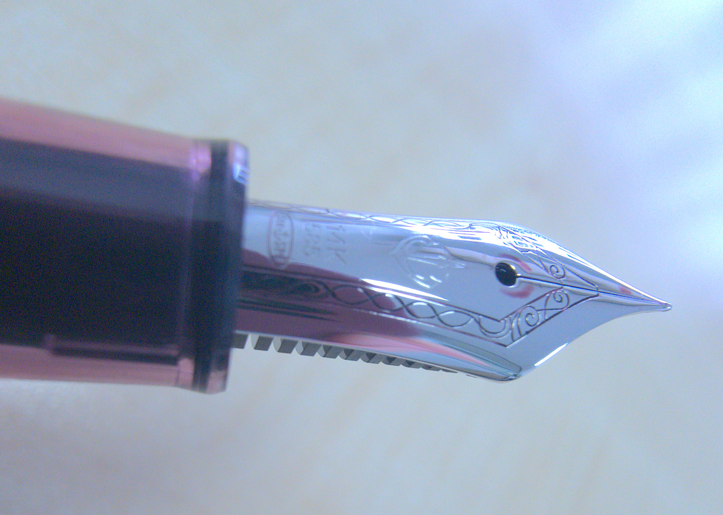 Per questa edizione di penne Manyo sono disponibili solo tre misure di pennini: fine, medio-fine e medio. Io ho acquistato il pennino fine. E' un pennino in oro 14 carati rodiato.