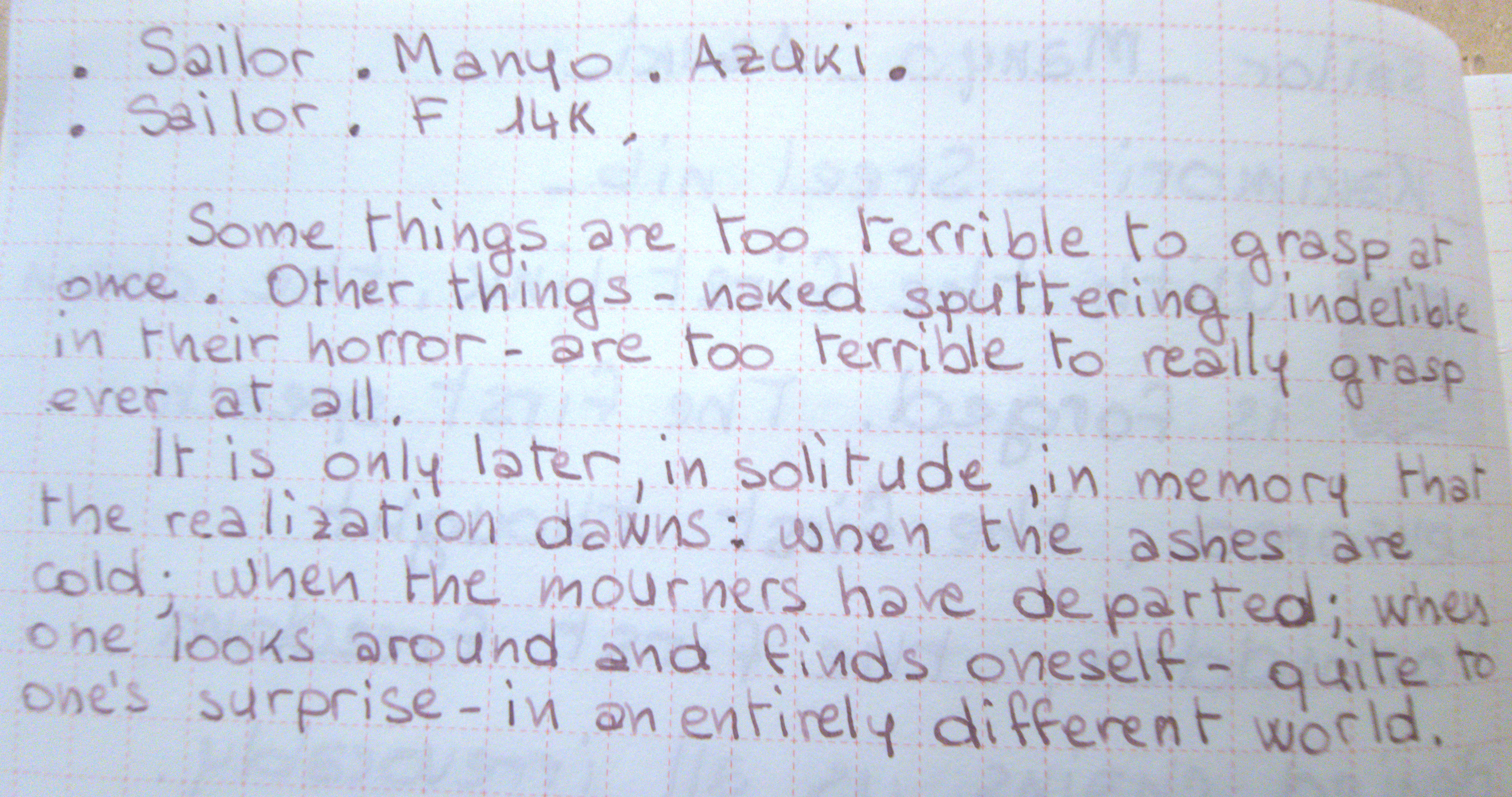 In precedenza l'avevo caricata solo una volta per qualche giorno, subito pensionata perché il pennino era troppo grosso, nonostante dichiarato fine. Mi serviva una penna che non avessi alcun problema a voler maltrattare e l'ho usata parecchio nelle ultime tre settimane: mi sono trovata bene (con l'impugnatura, preciso. Il pennino che ha è - per i miei standard - un BB e mi fa schifo), quindi, ho ceduto. E non ho nemmeno dovuto decidere quale inchiostro metterci: ci ho messo il suo.