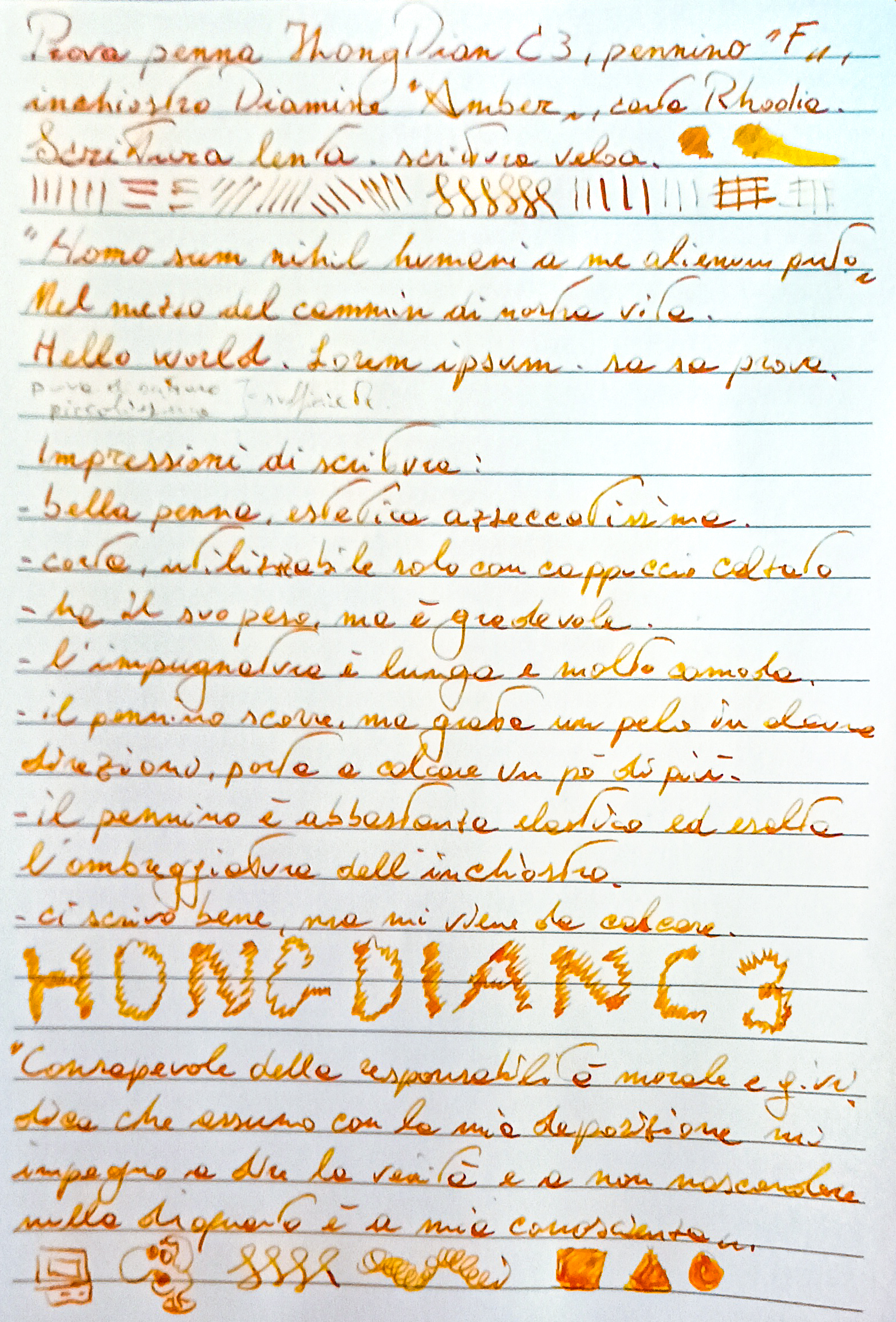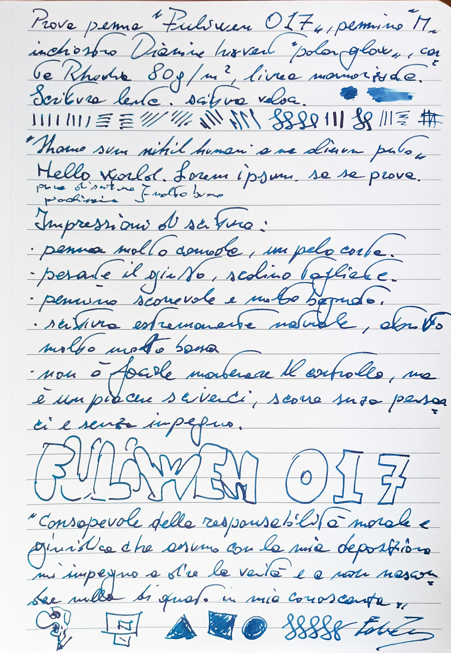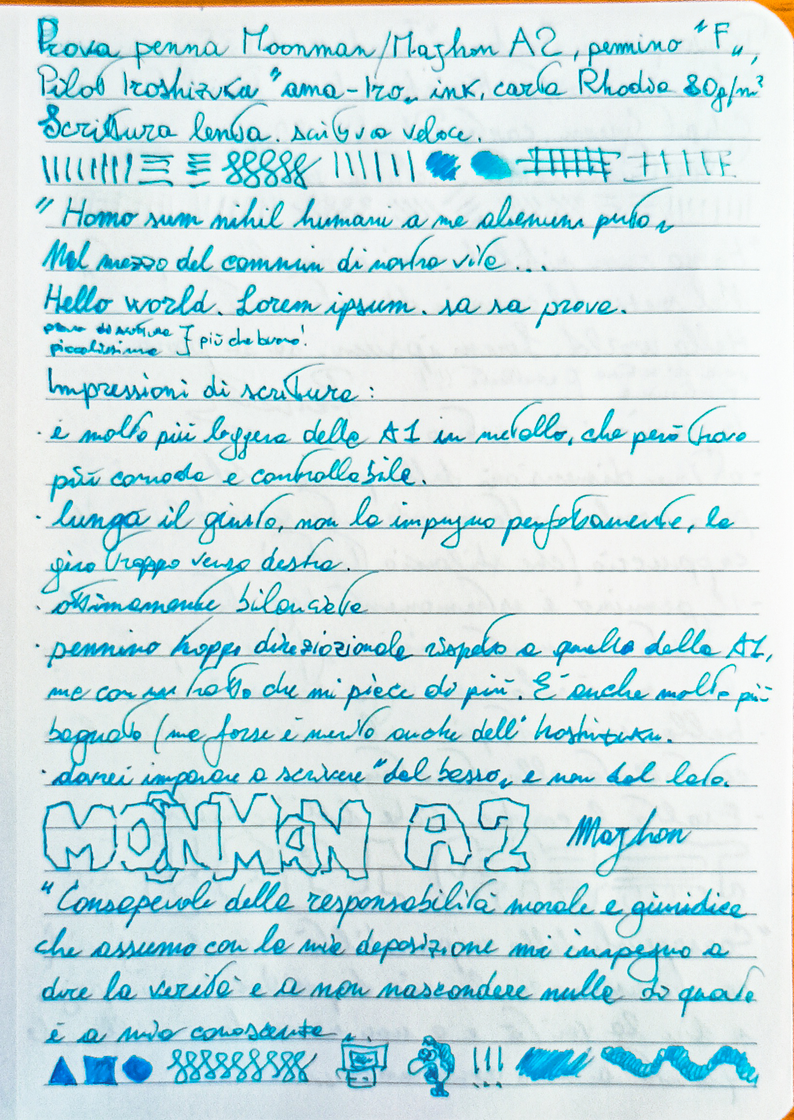 Comodissima da impugnare, dimensioni generose, bel bilanciamento ma soprattutto un pennino che è una piuma sulla carta, senza che comunque salti mai un minimo segno. Il tratto M aiuta nella scorrevolezza, ma è la sensazione di leggerezza che mi ha incredibilmente stupito. Posso andare avanti pagine e pagine senza alcuna, neanche marginale, fatica d'uso.![]()