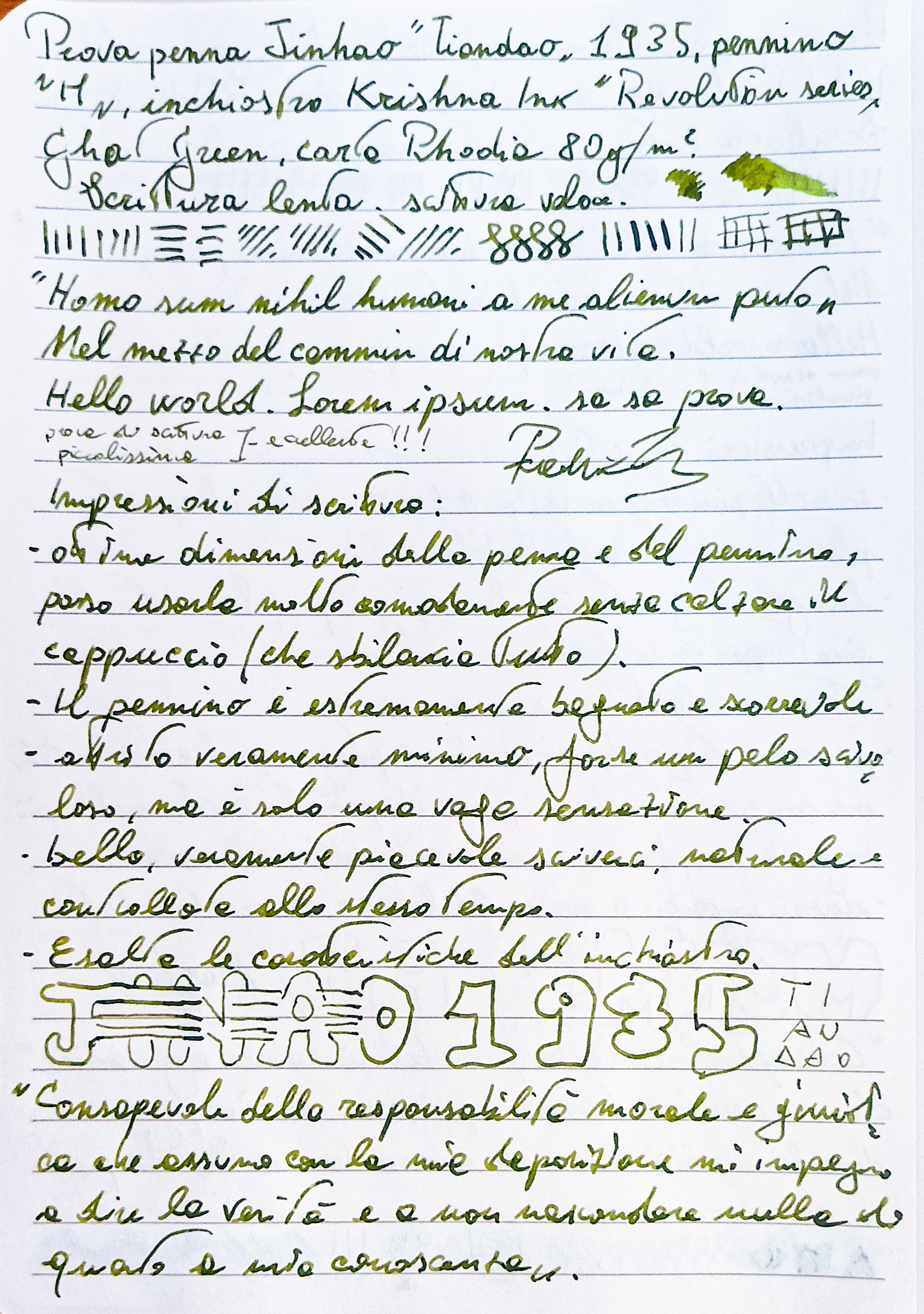 Il pennino è un "M" scorrevole, bagnato e leggiadro quasi quanto quello della Jinhao Tiandao descritta sopra; anche in questo caso scriverci mi è sembrato un vero piacere, considerando anche che il tratto M di questa Fuliwen è decisamente più ristretto rispetto agli M Jinhao e HongDian.