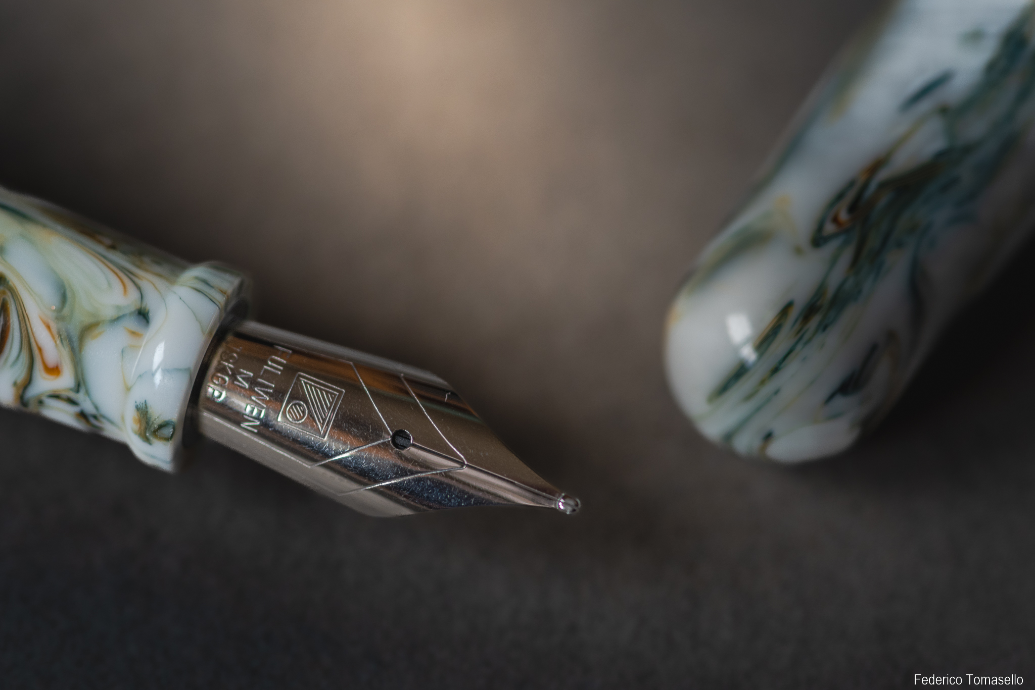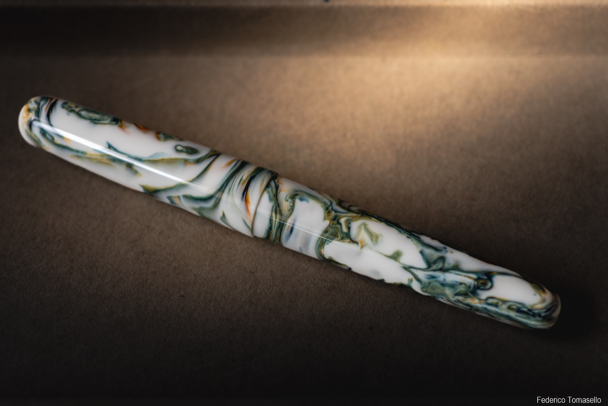 La penna ha una forma abbastanza classica, con cappuccio senza clip, ma una bella livrea marmorizzata bianca con venature verdi; inoltre la costruzione sembra a prova di bomba, con plastiche spesse e ben tornite. Giusto lo "scalino" sull'impugnatura poteva essere meno spigoloso, stona un po' con il tondeggiare delle altre forme. Ma è un peccato veniale, per quanto mi riguarda.