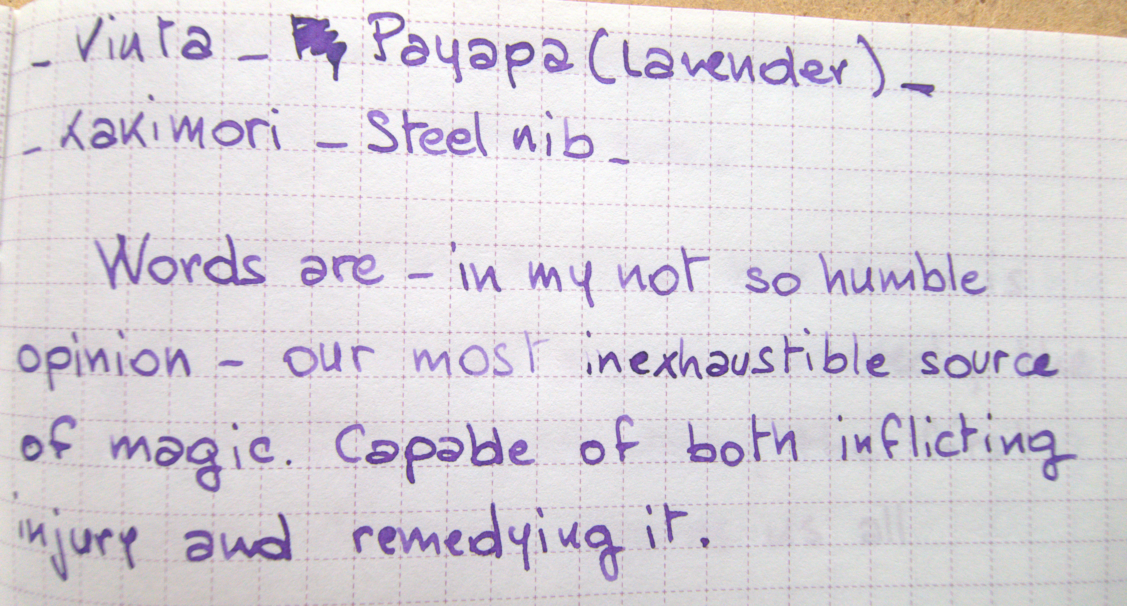 Payapa ha un flusso medio, nella norma, è ben leggibile con qualunque pennino e ha una vaga nota desaturata che lo rende molto gentile come colore. Lo trovo, personalmente, molto bello.